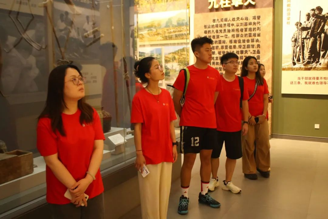 探寻红色印记,感悟奋斗史诗。在工作人员的引导下,团队先后踏访了天潭水库、龙泉、九间棚村旧址等承载着历史记忆的场所。站在昔日的“干山顶”,俯瞰今日层叠的梯田、葱郁的金银花田和整洁的新村,成员们直观感受到九间棚“旧貌换新颜”的震撼变迁。随后,团队成员通过观看纪录片、聆听讲解,深入理解了九间棚“九柱擎天”带领群众攻坚克难的感人历程,深刻认识到党建引领、群众主体、产业支撑是乡村振兴的关键所在。“这次的实践调研让我深刻认识到乡村发展的巨大潜力。”一位成员在参观后深有感触,“九间棚的前辈们‘敢教日月换新天’的魄力和智慧令人钦佩。作为一名大学生,我更加坚定了未来回到家乡的决心,要用所学知识和技能为助力乡村振兴贡献自己的力量!”