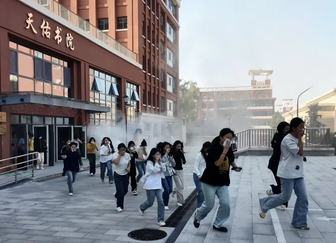 随着急促的消防警报声响起,消防应急疏散演练正式启动。演练模拟真实火情,警报声响起后,同学们反应敏捷,立即采取低姿弯腰、湿毛巾捂住口鼻等标准防护措施,沿着墙边安全通道的指示标志,快速有序地穿过弥漫着烟雾的楼道,向最近的出口撤离。志愿者在各楼层走廊、楼梯口等关键位置疏导人流,有效避免拥挤、踩踏等风险。在他们的有序引导下,同学们快速通过安全出口,向南楼南侧广场疏散。到达安全地带后,现场安全员立即进行人员清点。经核对,天佑书院全体大一新生全部撤离至安全区域,全过程高效规范,达到了“安全、快速、有序”的演练目标。