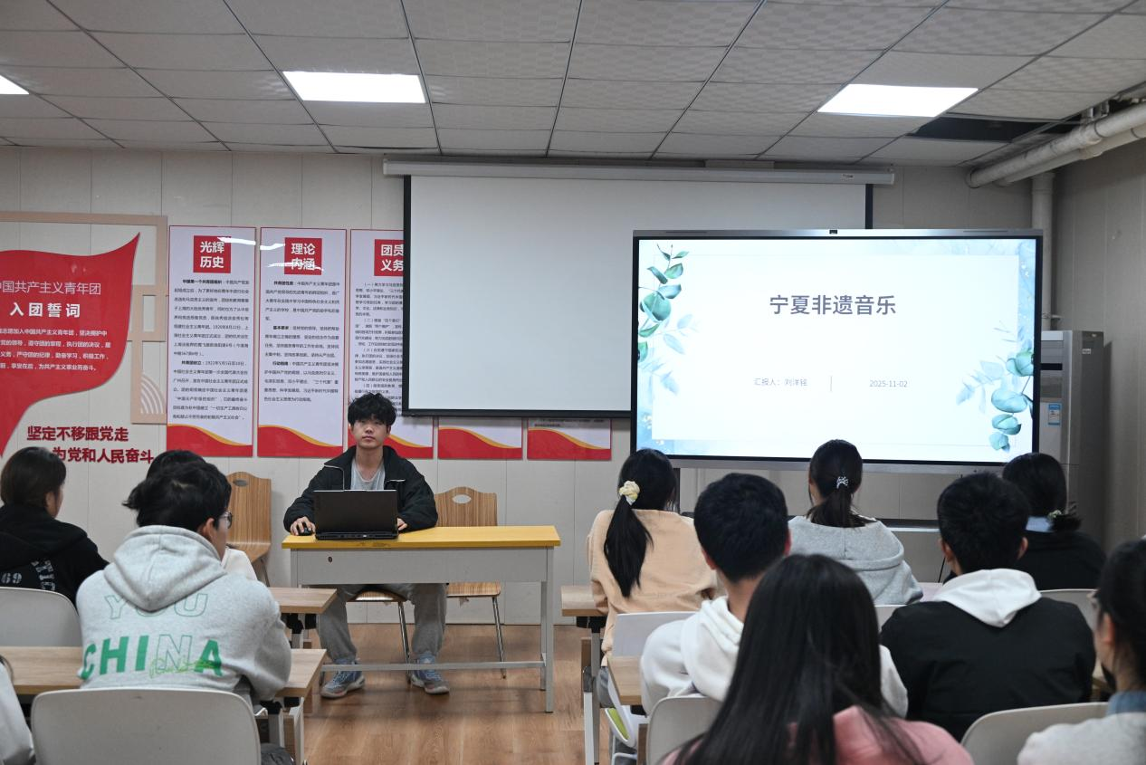 25508书社的李苏颖向同学们介绍了宁夏民间文学,涵盖民间故事、神话传说、民间歌谣、民间谚语,反映了宁夏人民的生活智慧。25512书社的刘洋铭介绍了宁夏民间音乐,包括回族山花儿音乐、道情音乐、口弦艺术、宴席曲、皮影戏音乐等,展现了这片土地上丰富多彩的艺术魅力与深厚的历史底蕴。