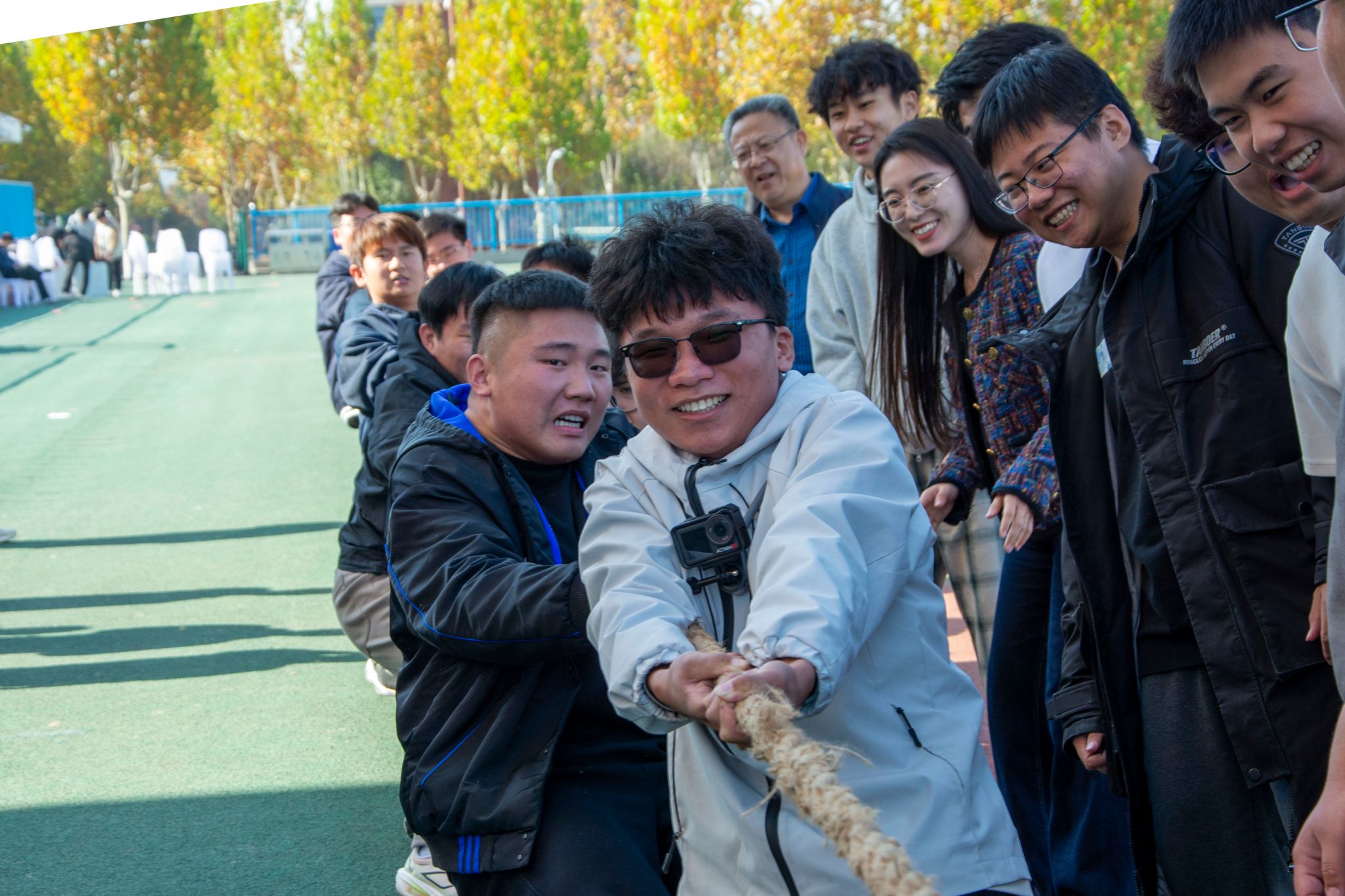 一根长绳横贯赛场,系于中央的红绸如同跳动的火焰。现场屏息凝神间满是张力,少年们个个攥紧双拳、目光炯炯。随着裁判的哨音破空而起,较量瞬时爆发。双方队员们十指紧扣绳身,双脚牢牢扎根地面,身体后倾如满弓,额间青筋暴起,齐心协力将长绳拉向己方。震耳欲聋的呐喊与整齐划一的口号交织,让热烈的气氛席卷整个赛场。