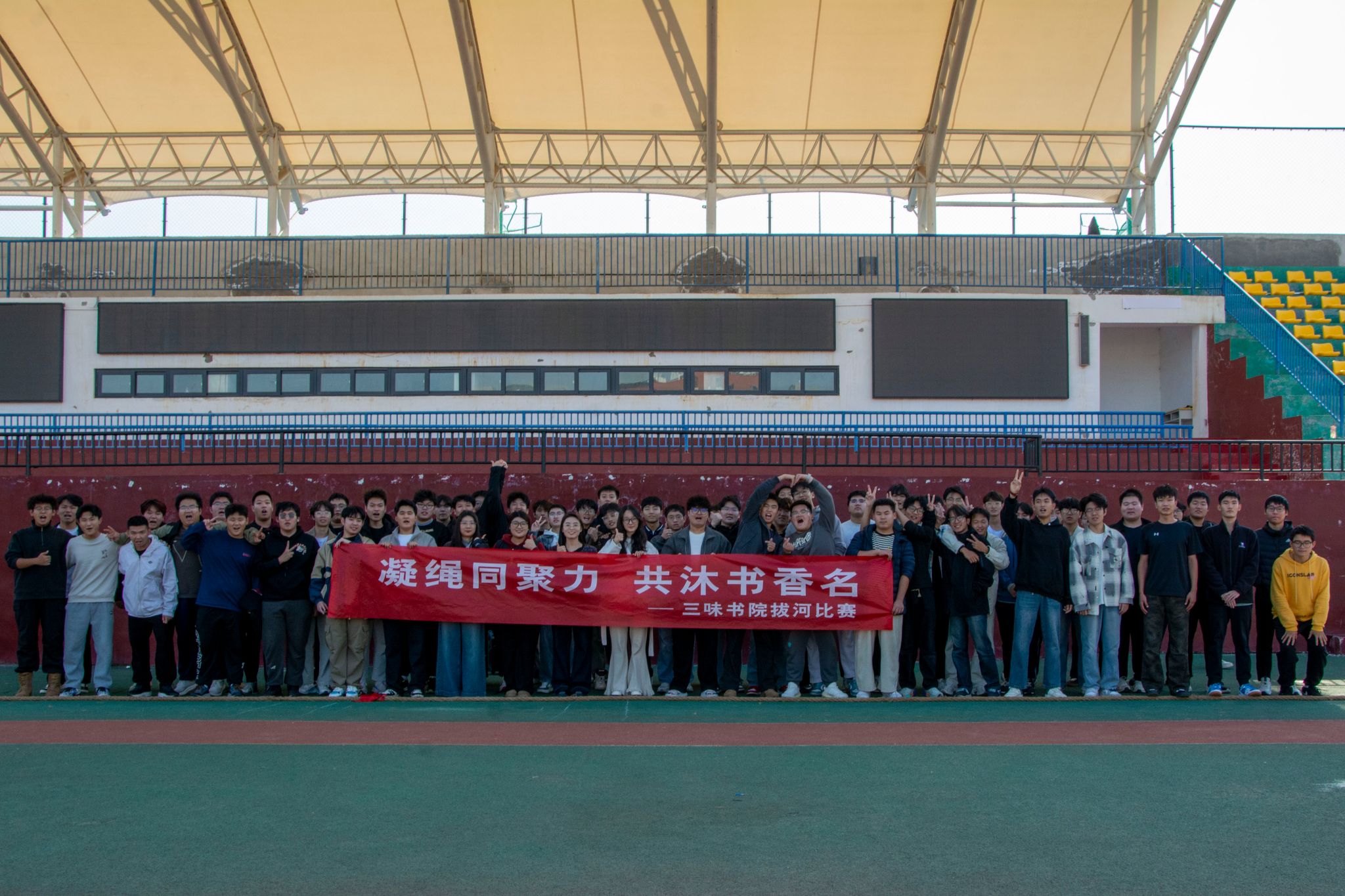 为丰富校园文化生活,凝聚集体力量,11月10日至13日,三味书院在东操场举办以“凝绳同聚力,共沐书香名”为主题的拔河比赛。活动吸引了24级、25级的200余名同学参加。