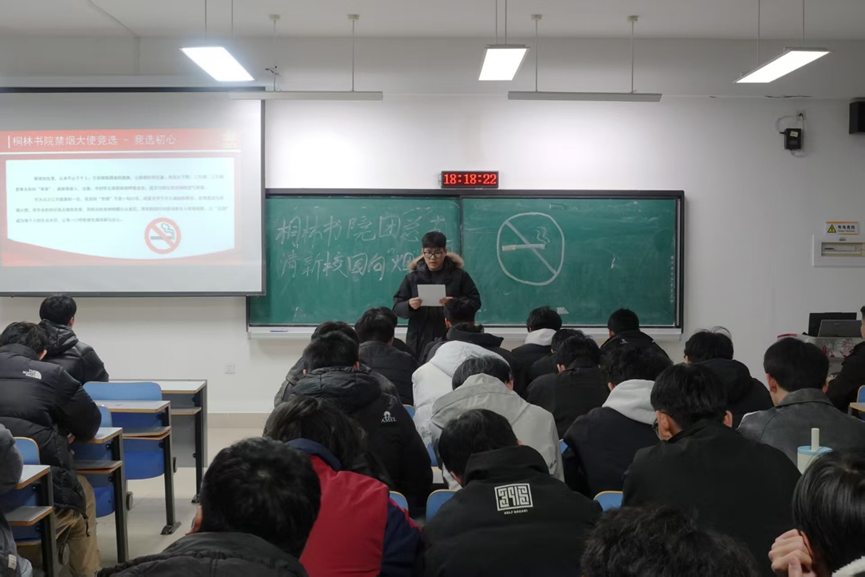 为深入推进清新校园建设,引导学子树立远离烟草的健康观念,11月30日,桐林书院在9号教学楼510教室举办“清新校园,向‘烟’说不”控烟讲座暨“控烟形象大使”宣讲活动,桐林书院24206书社王承砚担任主讲人,书院部分学生参加活动。