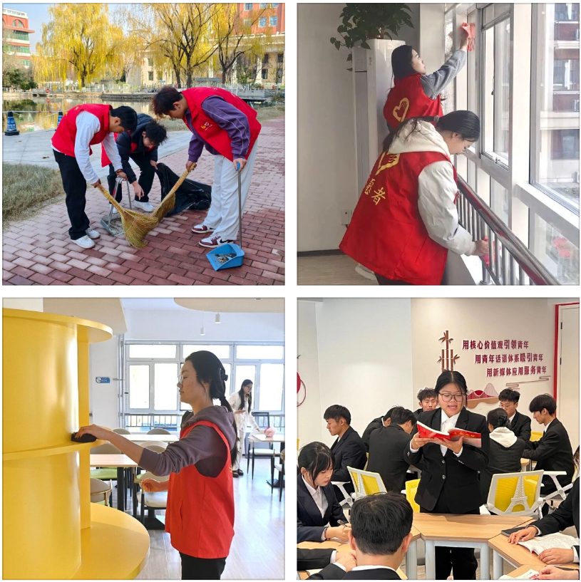 此次活动主要进行内部公共区域清洁与外围道路环境整治工作。首先,同学们对书院内部公共区域进行卫生清理,认真擦拭门窗桌椅及卫生死角,仔细清扫地面并归位桌椅。劳动过程中,大家热情高涨、协作默契,努力为师生营造整洁、舒适的环境。随后,大家来到书院外围道路,开展道路垃圾捡拾、落叶清扫与绿化带杂物清理工作,确保道路畅通、环境洁净,充分展现了当代青年良好的精神风貌。