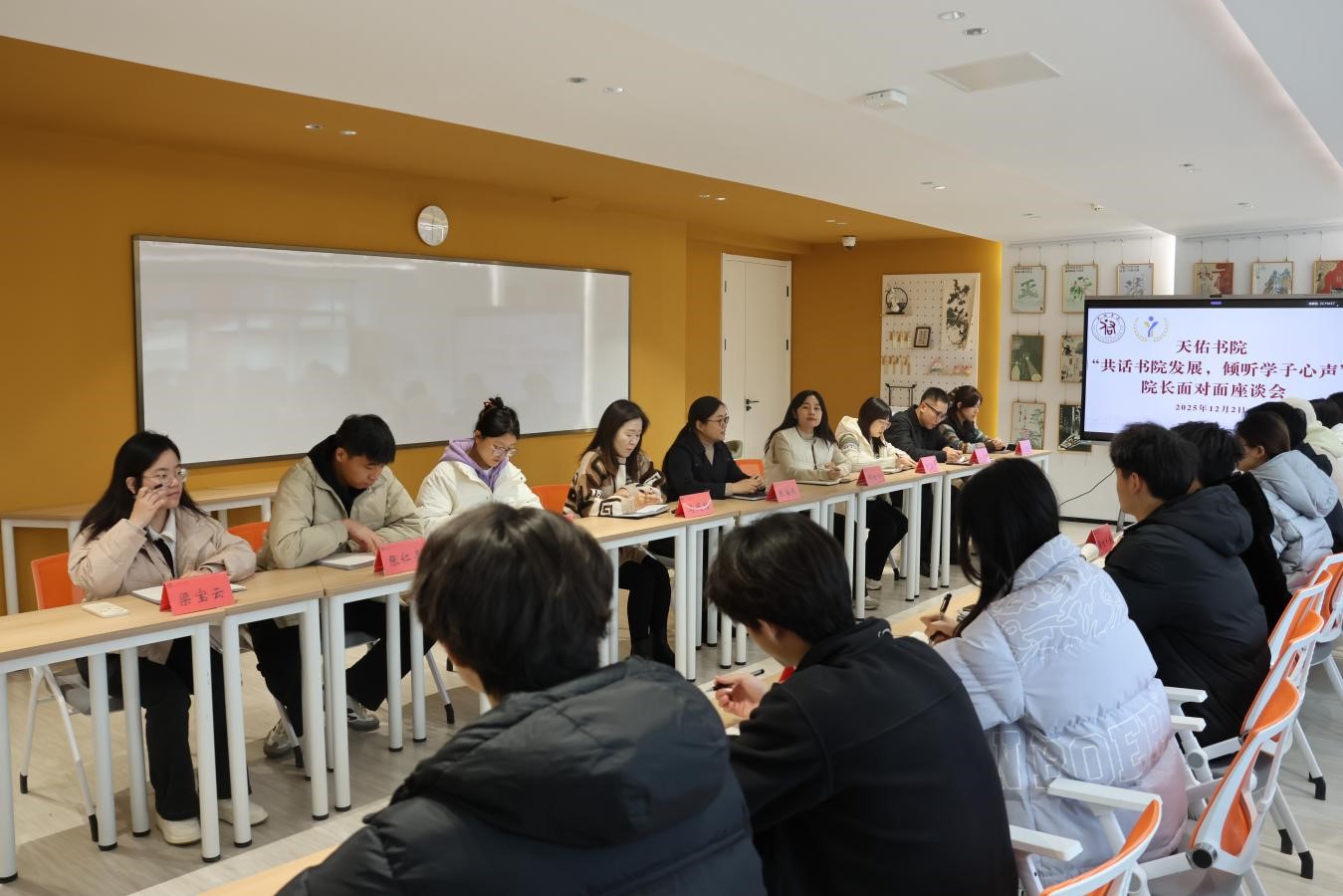 为搭建师生沟通桥梁,切实关注学生成长需求,12月2日,天佑书院在TY203学生发展中心举办以“共话书院发展,倾听学子心声”为主题的院长面对面座谈会。天佑书院党总支书记、院长陈海燕,各年级辅导员及2024级学生代表参加活动。