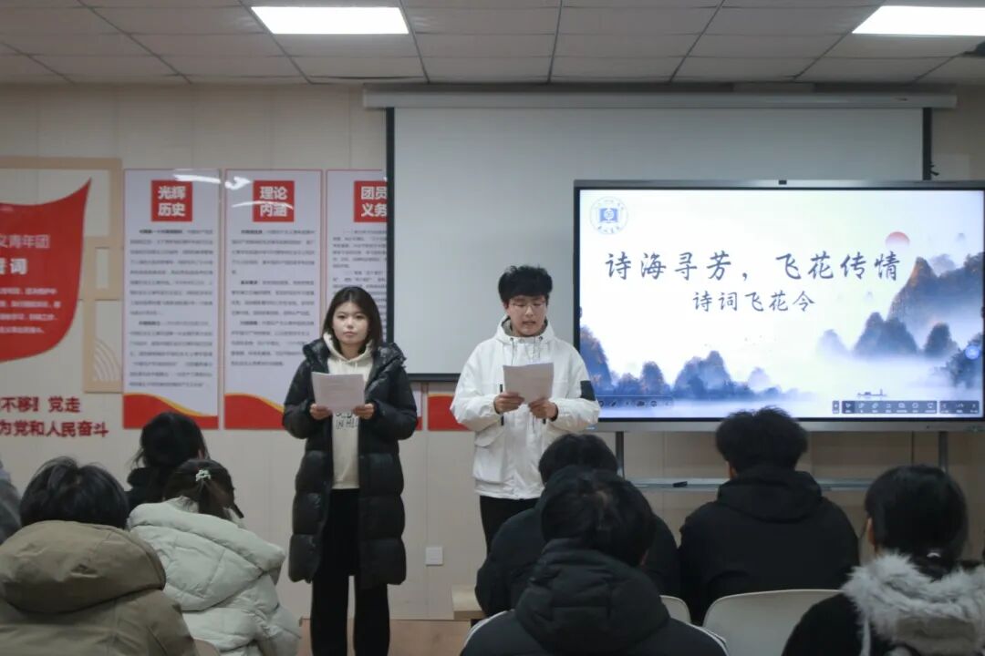 活动中,同学们两人为一组,通过抽签确定“花”“寒”“酒”等经典意象作为关键字展开对决。选手们凭借扎实的诗词功底与敏捷的才思,在平仄韵律间交锋比拼,于经典字句中传递文脉雅趣,充分彰显飞花令的文化意味与竞技魅力。大家沉浸在浓浓的诗词氛围之中,感受到了诗词所带来的无尽魅力与力量。
