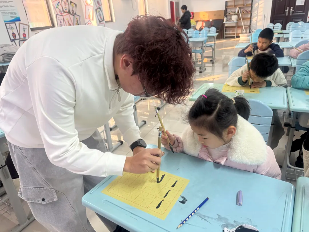 活动以书法知识科普开篇,志愿者围绕汉字演变脉络,讲解了甲骨文、小篆、隶书、行书、楷书的书体特点,借助生动的故事和易记的口诀,帮助孩子们掌握“真如立,行如行,草如走”的书体辨识技巧,传递坚持专注的学习理念。科普环节后,志愿者为孩子们准备毛笔、墨汁等书法工具,开展实操教学。通过现场指导,教授孩子们正确的握笔、运笔姿势,让孩子们在实践中学习书法基础技能,感受汉字结构特点。