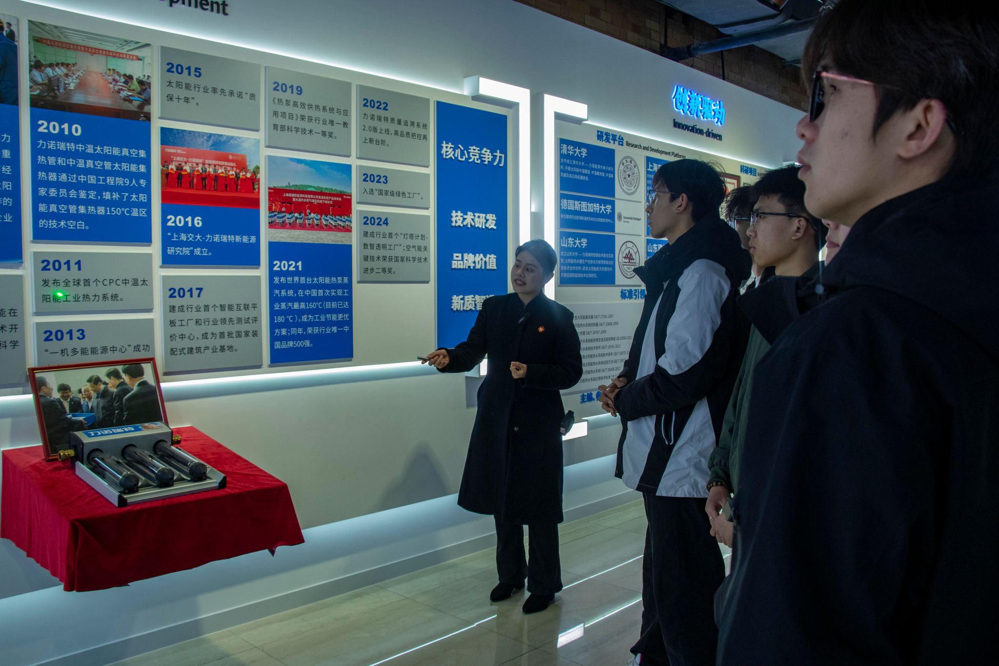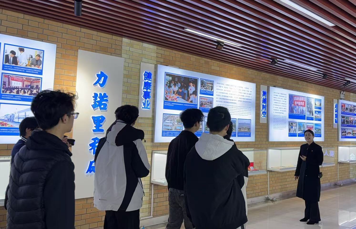在力诺集团工作人员的引导下,师生们首先参观了集团的科技展厅。展厅内陈列着企业在太阳能、制药、玻璃制品等领域的最新研发成果。工作人员详细介绍了集团的发展历程、核心技术以及未来规划,同学们认真聆听,不时记录,对力诺集团在科技创新方面的成就赞叹不已。