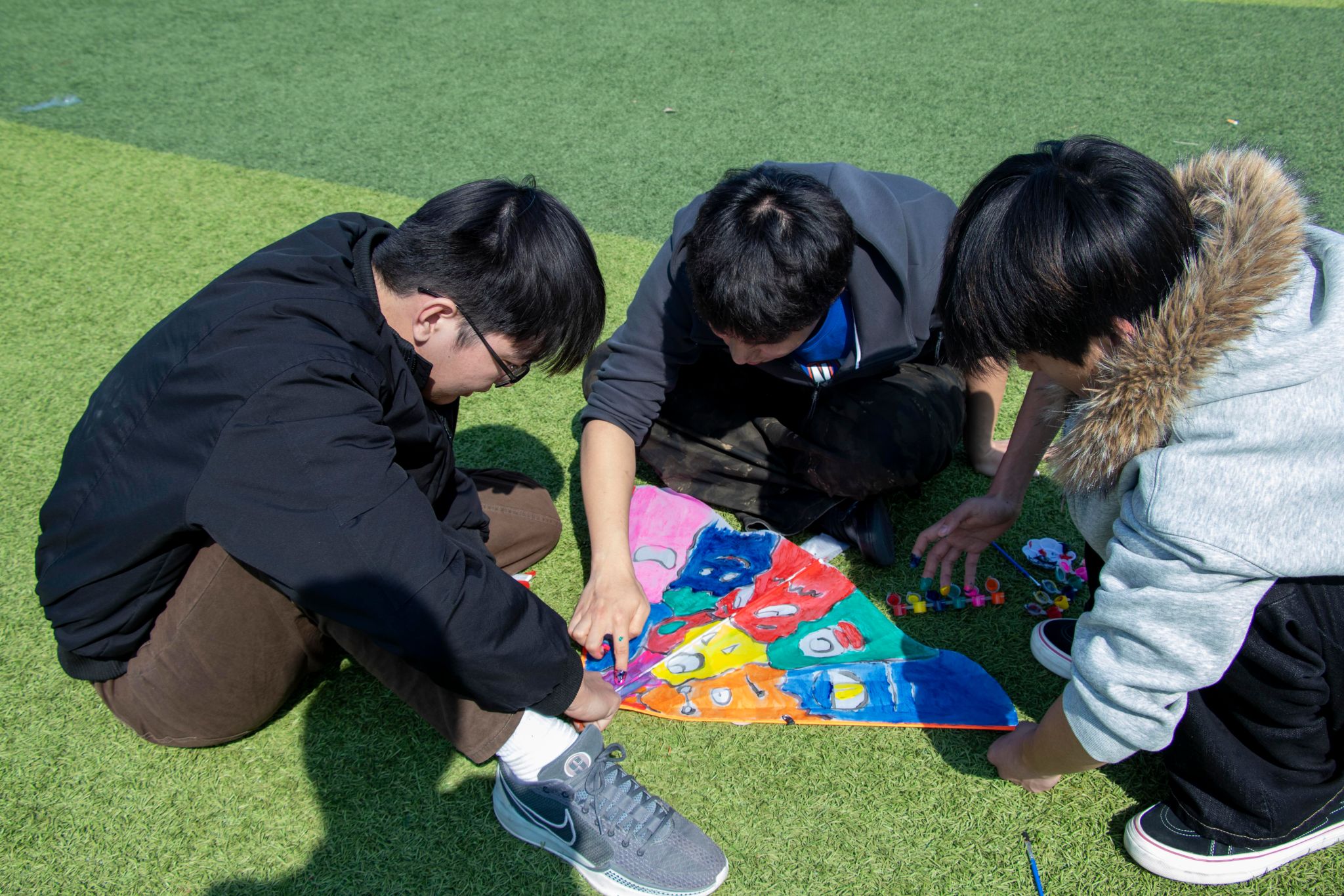 活动开始后,同学们分组协作,围绕“青春活力”“传统文化”“心理健康”等主题开展风筝制作与彩绘。现场分工明确,同学们或勾勒线条,或填充色彩,将创意与愿景融入风筝绘制中,既展示了艺术素养,也体现了团队协作能力。原本素净的风筝骨架,经大家亲手绘制,成为色彩斑斓、形态各异的风筝作品。