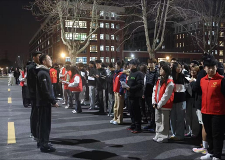 当晚20时,消防警报声划破夜色,演练正式启动。在低能见度的环境下,身穿红马甲的安全员们迅速到达楼道拐角或楼梯口等关键点位,他们用清晰洪亮的声音提醒大家注意脚下台阶,避免拥挤;师生们在安全员的有序指挥下沉着应对,严格遵守“安全快速,就近撤离”的原则,从各宿舍楼沿既定路线快速撤离,循着规范指引完成疏散后,井然有序地抵达集合点;各书社负责人随即清点人数,核对名单,确保全员安全集结,整个流程高效规范。