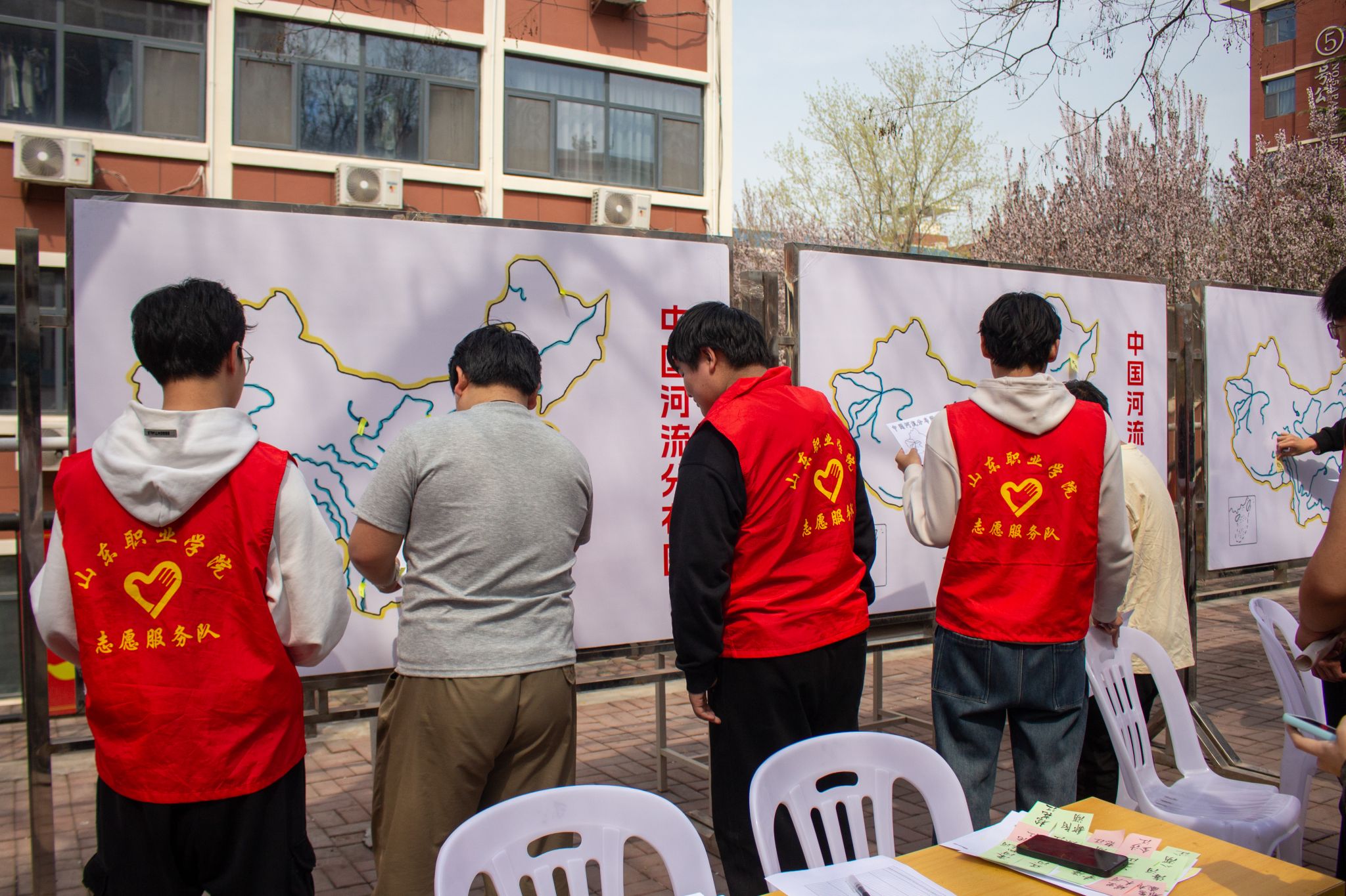 活动当天,“节水趣玩,滴水珍贵”室外实践活动在2号宿舍楼前顺利开展。在“识水系脉络,惜点滴水源”中国水系图填空辨认区,同学们有序参与答题,在水系地图上粘贴对应名称,在趣味比拼中熟悉中国水系分布,深化对水资源的认知;与此同时,“惜水护水,签名承诺”条幅书写区同步开放,同学们依次在节水主题条幅上写下原创节水标语和护水承诺,一笔一画间,既彰显着对节水理念的认同,又传递出践行护水行动的坚定决心。其间,志愿者们还在三味书院各层洗手间的醒目位置张贴了节水海报,将节水提醒化作日常可见的温暖提示,让师生在潜移默化中树立节水意识。