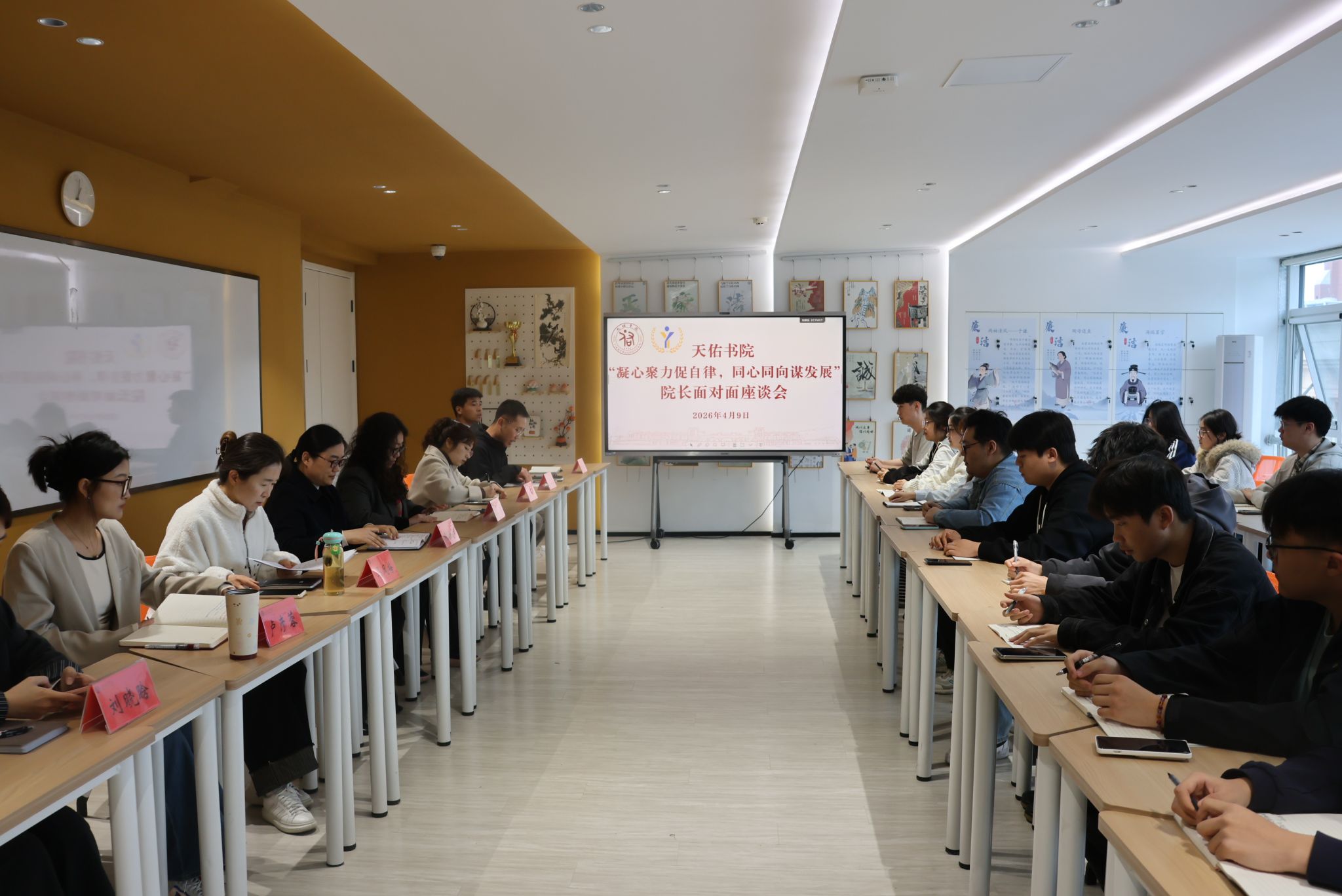 为进一步畅通师生沟通渠道,推动学生加强自我教育、自我监督、自我管理、自我服务的意识,4月9日,天佑书院在TY-203活动室举办“凝心聚力促自律,同心同向谋发展”院长面对面座谈会。天佑书院党总支书记、院长陈海燕,副院长杨硕出席会议,各年级辅导员及自律会学生代表参加会议。