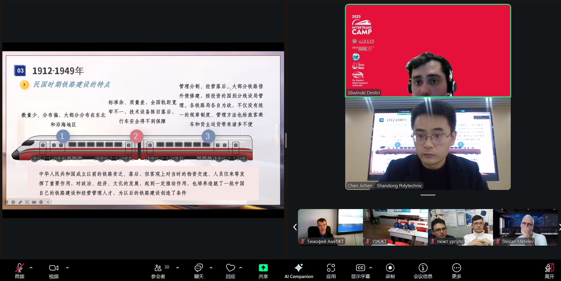11月4日以来,国际交通训练营开展了2次关键培训,我校城市轨道学院教师陈济臣受邀主讲,为中国、俄罗斯、马来西亚等10国轨道交通师生及从业者分别讲解“中国铁路发展”与“轨道车辆技术模块C技术规程”,彰显中国铁路技术的国际影响力。