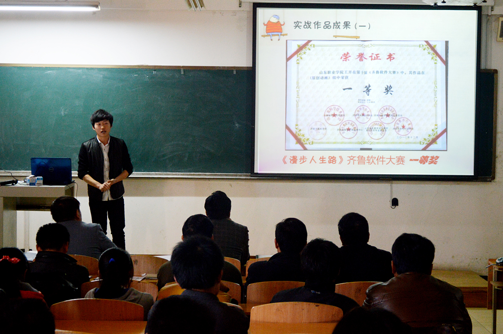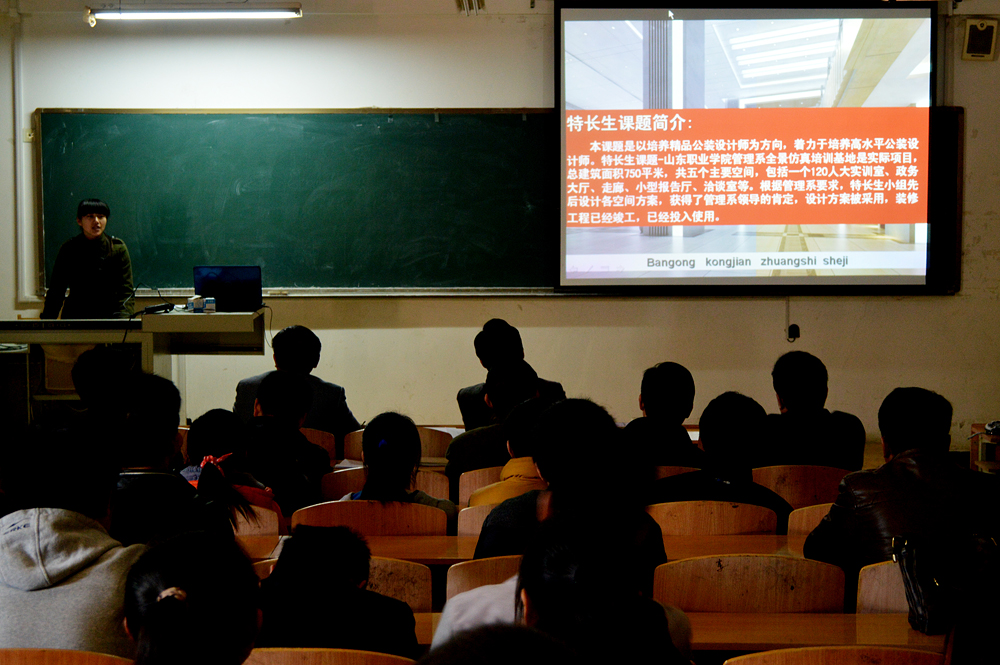日前,山东职业学院在4104教室进行了“学院2012年度特长生课题展示评议”活动,学院党委副书记、常务副院长马文卿代表院领导出席了展示活动,学院学术委员会成员14人担任评委并参加活动。 马文卿对参赛课题的质量给予了高度评价,指出特长生教育是我院的特色教育,在培养学生的专业技能和特长、团队合作意识等方面发挥着重要的作用。同时对如何普及和提高这种特色教育,让更多的学生受益,进一步提高特长生培养工作的质量等提出了标准和期望。 2012年度学院立项的特长生课题共62项,406名学生被选拔为特长生。参加展示评议的是各系按20%的比例推荐出的系级优秀特长生课题共16项。 每个课题由一名特长生代表对课题进行展示汇报。评委认真听取汇报,从课题选题、课题的实施过程、成果形式、汇报材料的组织和表达能力五个方面对课题进行了综合评定和赋分,工作人员现场统计合分,依据得分由高到低推出一等奖2项,二等奖4项,三等奖10项。电气系贾俊刚老师指导的“利民制药厂车间空调自控系统设计”、信息系郭娟老师指导的“二维动画制作”获得一等奖;机电系谭吉升老师指导的“废旧电线抻直机的设计、安装与调试”、土木系毕建波老师指导的“办公空间装饰设计”、土木系李增足老师指导的“变频空调器常见故障诊断与维修”、信息系牛文琦老师指导的“iPhone开发”课题获得二等奖,其它课题获三等奖。