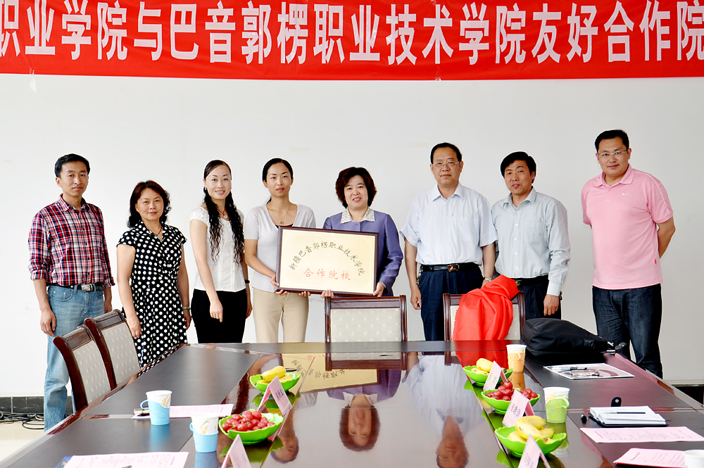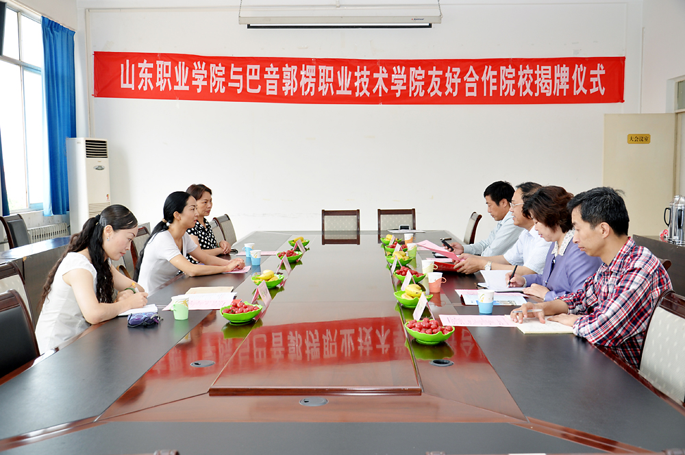 2011年5月27日,山东职业学院与新疆巴音郭楞职业技术学院进行了合作院校揭牌仪式 巴音郭楞职业技术学院党委委员、人力资源部部长张敏,留学生管理办公室主任、外事处处长易新兰,对外交流与合作处副处长孟轩羽一行三人来到山东职业学院,张敏部长介绍了巴音郭楞职业技术学院的情况,巴音郭楞职业技术学院成立于2002年,占地面积为3000多亩,主要专业有机电、机械、电器、石油等专业,在校生目前有13000多人,学院为了更好的发展,加强对外合作和经验交流,特与山东职业学院结对,进行两院师资交流和为两校合作院校挂牌。 山东职业学院院长邓洪基,副院长祝瑞花,教务处处长郭鹏,组织人事处处长崔君清,党办、院办副主任、国际交流中心主任王辉参加了揭牌仪式。邓洪基院长代表山东职业学院对巴音郭楞职业技术学院代表表示了热烈的欢迎,对山东职业学院做了简要的介绍,并对两院的合作寄予了期望。祝瑞花副院长向巴音郭楞职业技术学院代表介绍了山东职业学院的办学特色。并亲手为两校合作学院进行了揭牌。