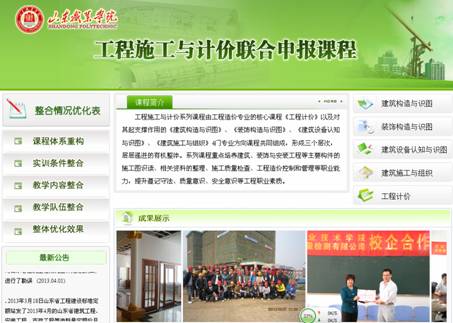 2013年5月,“铁路轨道施工及维修”课程和“工程施工与计价”1个课程群(包括工程计价、建筑设备认知与识图、建筑构造与识图、装饰构造与识图、建筑施工与组织)被评为院级精品课程。“铁路隧道施工及维修” 已建成院级优质资源课程,精品课程建设已初步成形。