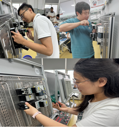 在企业工程师与培训人员组成的导师团队指导下,三位教师系统参与企业安全培训与电气装配实践。针对车间生产安全、员工安全防护等内容,导师团队采用“案例分析+理论讲解”模式,结合实际案例拆解风险点、讲解防护要点,帮助教师们扎实掌握生产安全防护技能。在电气装配实践中,教师们先后完成线束制作、电缆端头压接、电气柜组装、电气接线等实操任务,实践动手能力得到切实提升。