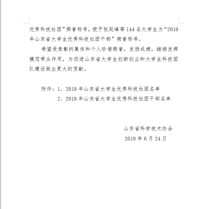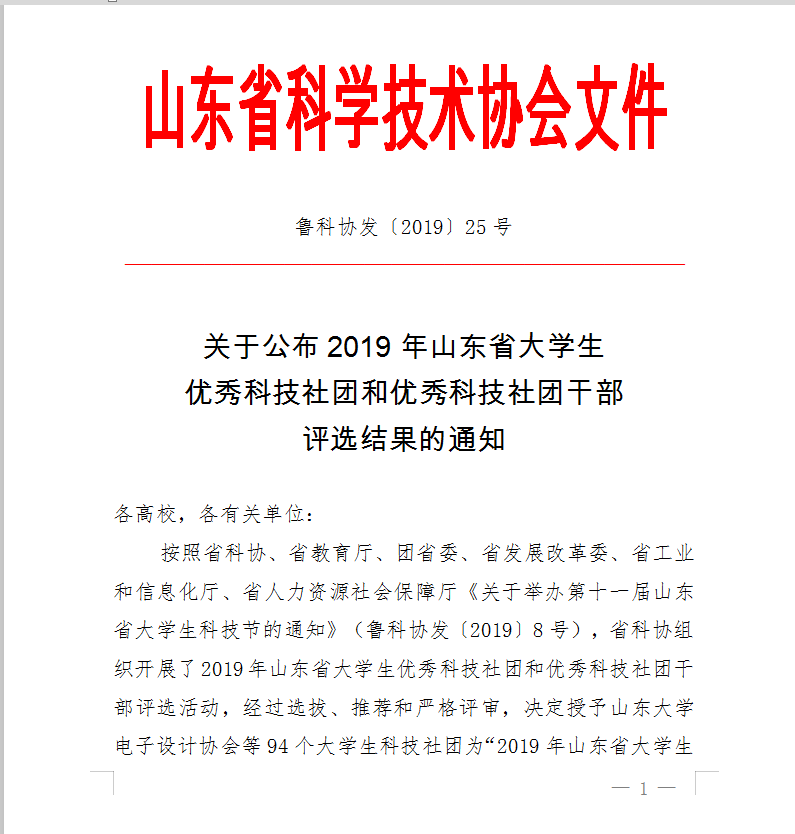近日,山东省科协评选表彰了2019年山东省大学生优秀科技社团和优秀科技社团干部,我院机器人创新协会获得“2019年山东省大学生优秀科技社团”荣誉称号,机器人创新协会会长贾磊和大学生发明创新协会会长刘志尊获得“2019年山东省大学生优秀科技社团干部”荣誉称号。希望学院广大学生社团和社团干部以我院获奖的社团和社团干部为榜样,努力进取,为促进学院大学生创新创业和大学生科技团队建设做出更大贡献。
