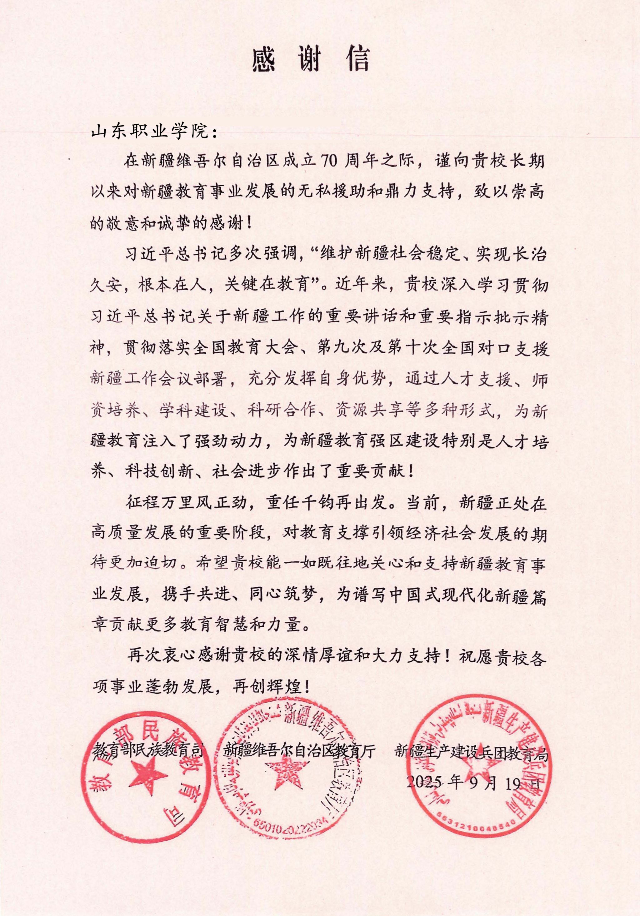 近日,在新疆维吾尔自治区成立70周年这一具有重大历史意义的时间节点,我校收到教育部民族教育司、新疆维吾尔自治区教育厅以及新疆生产建设兵团教育局联合发来的感谢信,向学校长期以来对新疆教育事业发展的无私援助和鼎力支持表达崇高的敬意与诚挚的感谢。