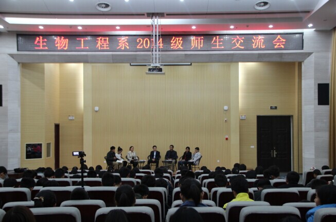 为了让2014级新生更好的了解大学生活,也为了解决同学们当前的困惑,生物工程系于上周在图书行政楼西报告厅举行2014级师生交流会。出席交流会的有生物系党总支书记郑治国、学工办主任赵迎、团总支书记于磊娟,教师代表王绍良、王艳以及全体2014级新生。