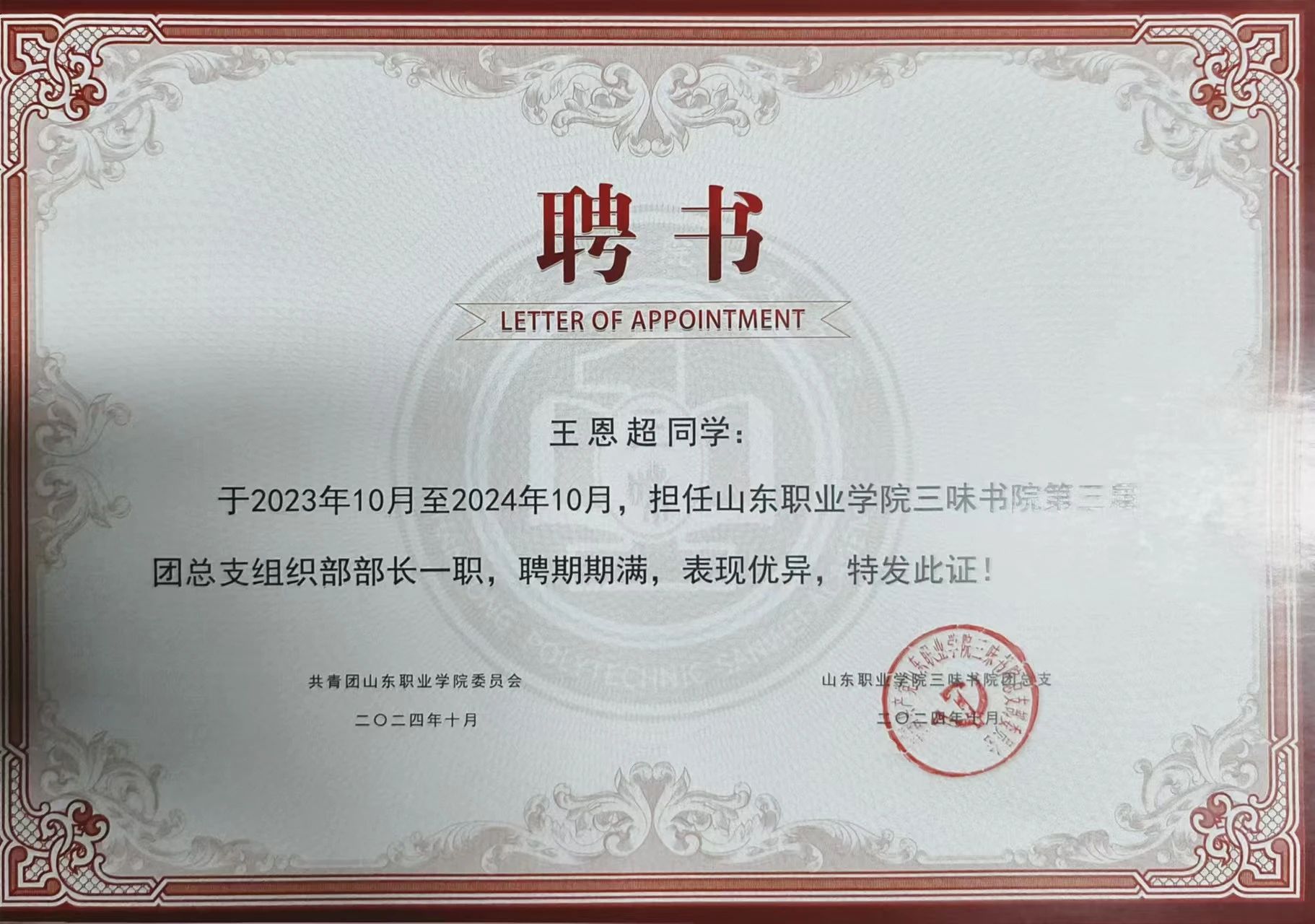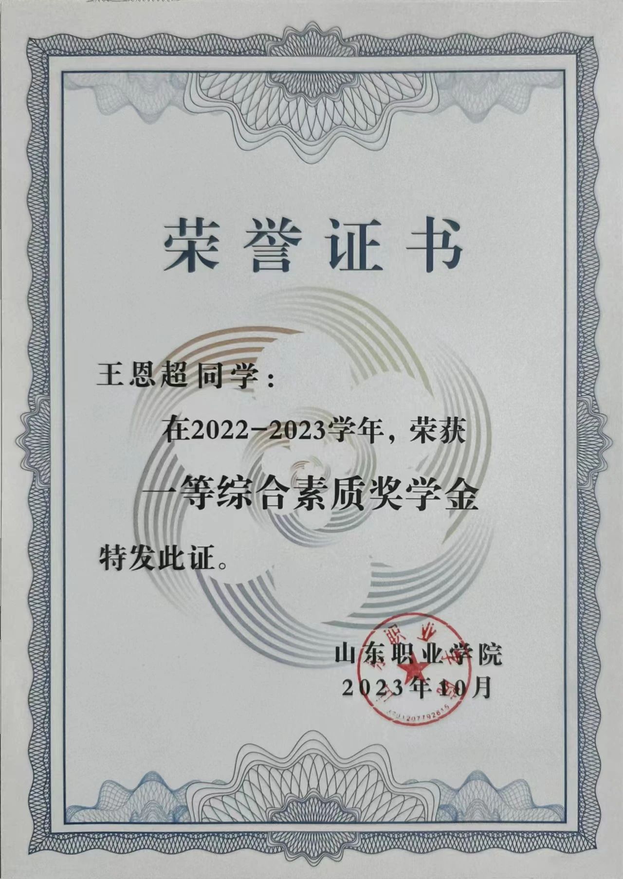 王恩超,共青团员,新一代信息技术学院计算机网络技术2232班学生。成绩排名专业第一,曾获国家奖学金、山东省优秀学生、山东省大学生计算机技术应用大赛一等奖、山东省职业院校技能大赛二等奖、多次获得校内“综合测评一等奖学金”、 “优秀学生”、“优秀学生干部”、“优秀团学干部”等,获得省部级奖项5余项,各类奖学金及荣誉共计20余项。