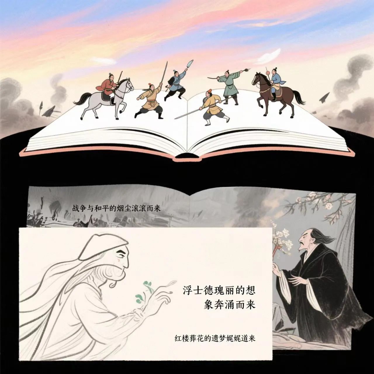 如果你站在求知的路口不知该往哪去,那么我也在书里等你。在书里有孔孟老庄儒道齐家治国的胸怀理想。在书里有希腊先贤建立理想国度的蓝图希望。屈原的香草美人在书里,荷马的壮阔史诗在书里,李白的锦心绣口在书里,莎士比亚的不朽戏剧还在书里。当你打开书,梁山好汉的豪爽扑面而来,战争与和平的烟尘滚滚而来,浮士德瑰丽的想象奔涌而来,红楼葬花的遗梦娓娓道来。