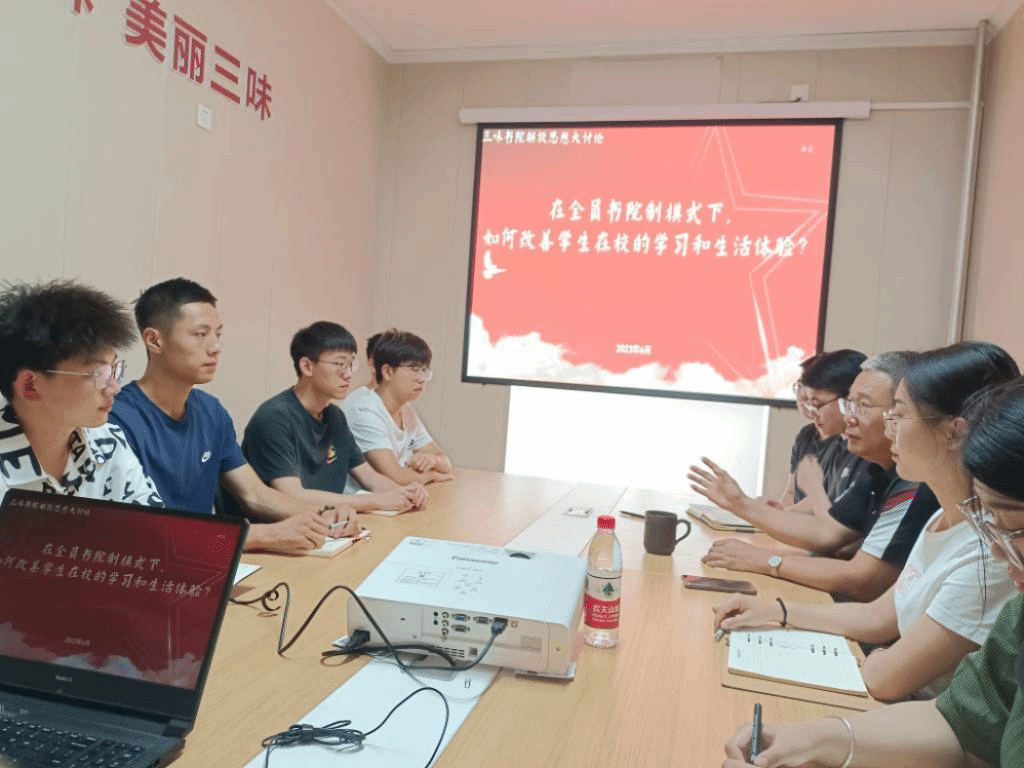 为深入开展学习贯彻习近平新时代中国特色社会主义思想主题教育,强化理论武装,6月20日,三味书院在2209会议室开展了第二期解放思想大讨论活动。本次讨论的主题是“在全员书院制模式下,如何改善学生在校的学习和生活体验”,活动由三味书院党总支书记、院长吕立宁主持,全体辅导员及15余名学生参加。