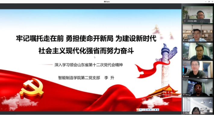 省第十二次党代会于5月28日至6月1日在济南召开,智能制造学院教师李升作为党代表出席本次大会。大会结束后,李升老师在智能制造学院与三味书院共同开展的“深入学习贯彻山东省第十二次党代会精神”线上主题党课活动中及时传达了大会精神。智能制造学院和三味书院全体党员教师,三味书院入党积极分子100余人参加了活动。活动由智能制造学院党总支副书记唐勇主持。