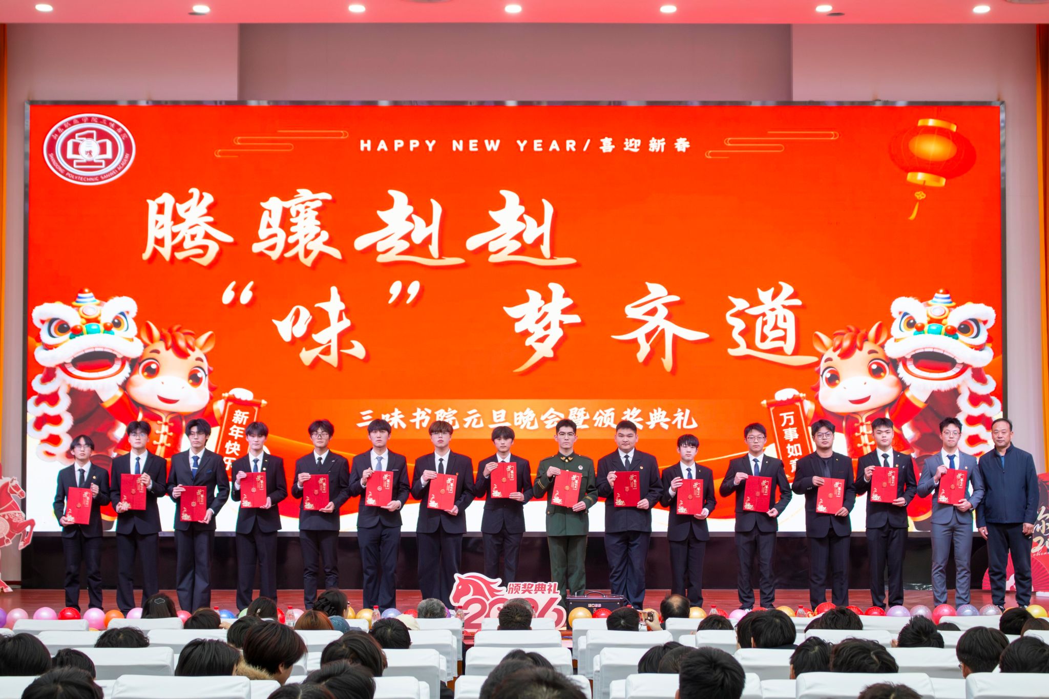 为庆贺元旦佳节、表彰书院先进典型、凝聚师生奋进力量,12月29日,三味书院于图书行政楼西报告厅隆重举行“腾骧赳赳,‘味’梦齐遒”2026年元旦晚会暨颁奖典礼。山东职业学院党委副书记郭鹏、安保处处长吕鹏、三味书院党总支书记兼院长王广勇、副院长李亚飞、全体辅导员及400余名学子欢聚一堂,共迎新年。
