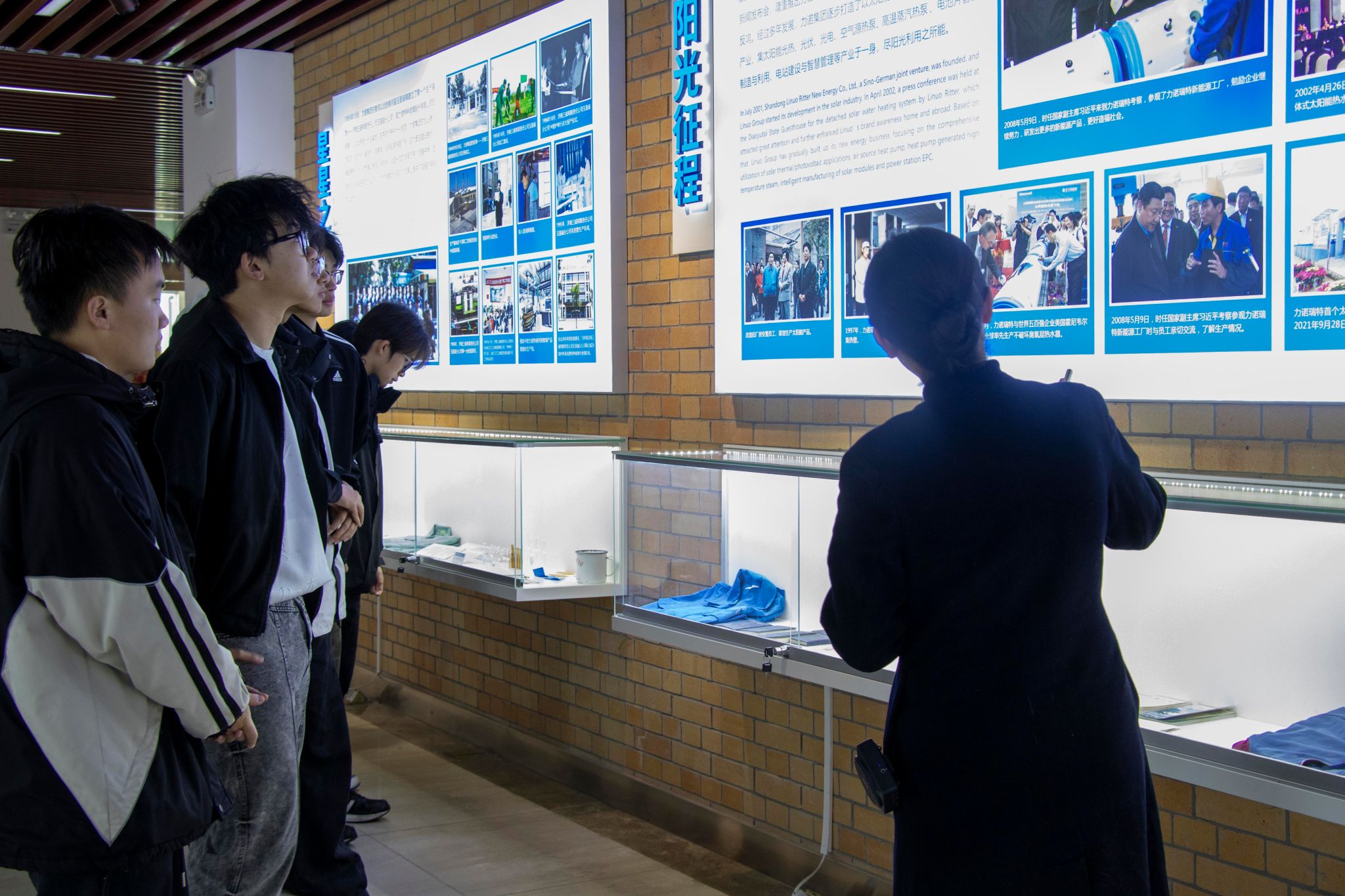 在力诺集团工作人员的引导下,师生们首先参观了集团的科技展厅。展厅内陈列着企业在太阳能、制药、玻璃制品等领域的最新研发成果。工作人员详细介绍了集团的发展历程、核心技术以及未来规划,学生们认真聆听,不时记录,对力诺集团在科技创新方面的成就赞叹不已。