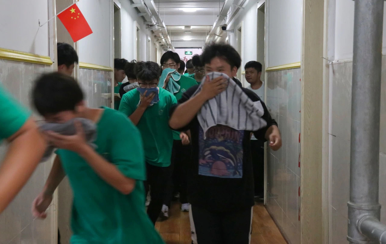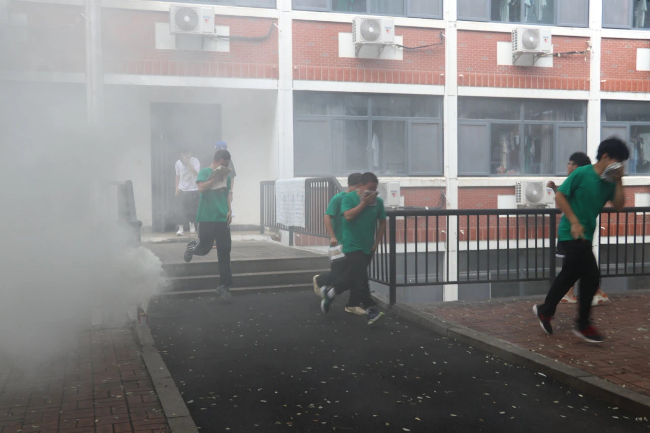 随着烟雾燃起,听到哨声指令后,消防演练正式开始了,各位负责人迅速到达指定岗位引导疏散。在各楼层楼梯口引导员的引导下,全体学生听从指挥,有条不紊,捂住口鼻,弯腰小步快走,按照既定路线有序撤离,做到了快速、安全、有序,展现了较强的纪律性和良好的团队作风。