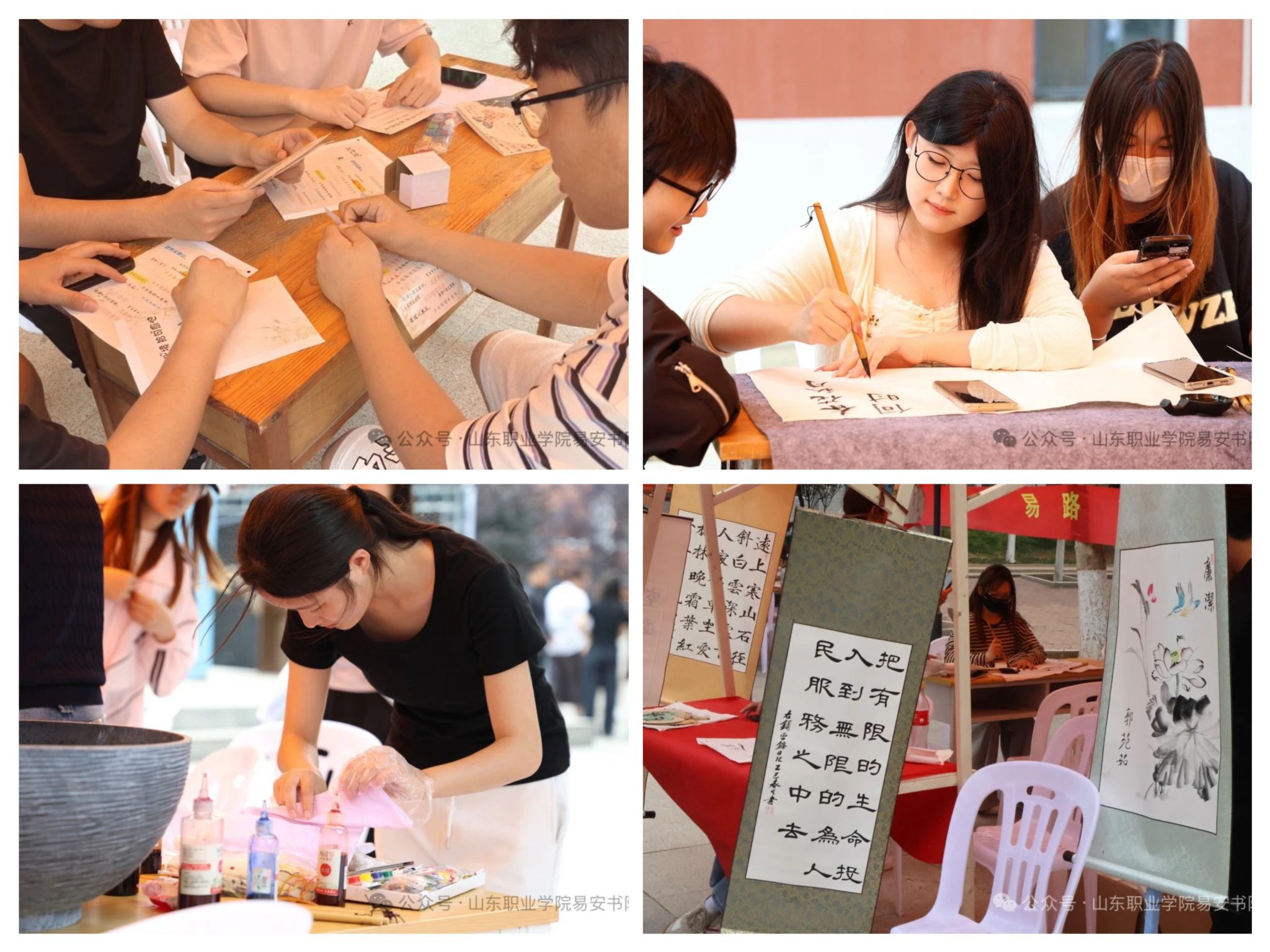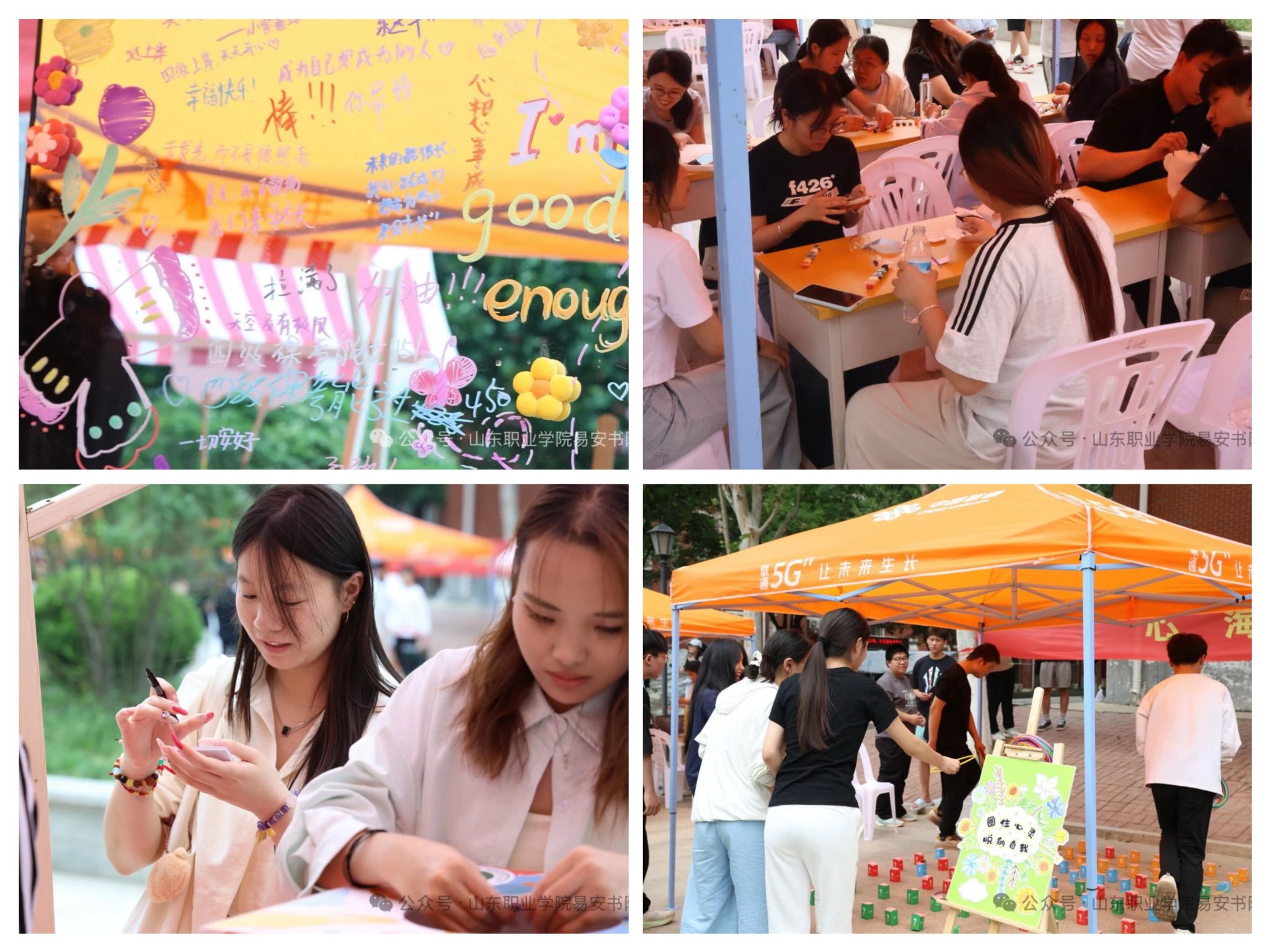 活动以“诗词疗愈”“传统工艺体验”“积极心理引导”“易岭逐光,影映未来”“拥抱治愈”“情绪盲盒”六大核心板块展开。在诗词拼贴环节,学生通过古典诗词创作实现情绪表达与文化共鸣;手工扎染、竹简书写等传统技艺体验中,参与者通过动手实践与作品分享,强化心理韧性;创意手作区则以帆布包彩绘、镜子装饰等活动为载体,引导学生释放压力、激发生活热情。此外,“拥抱治愈”“情绪盲盒”等互动项目通过肢体接触与情感共鸣,营造温暖支持氛围,帮助参与者建立积极认知模式。