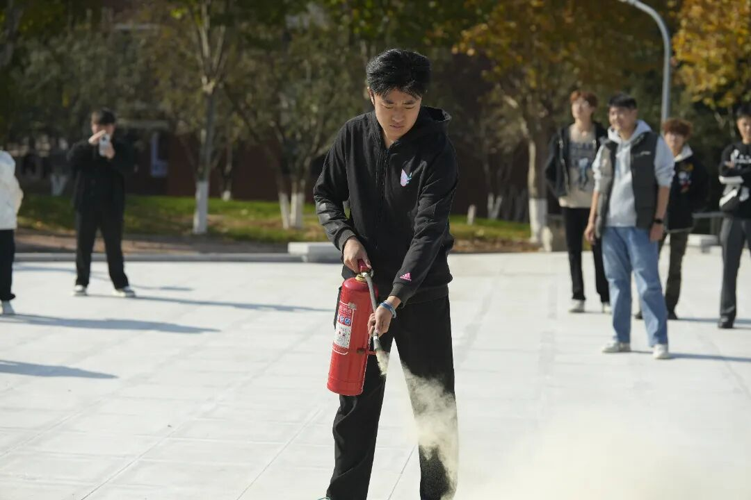 同学们在预先设定的安全演练区,进行灭火器实操演练。随着空旷场地的模拟火盆被点燃,闫琪现场演示了干粉灭火器的正确使用步骤“提、拔、握、压”四字口诀。