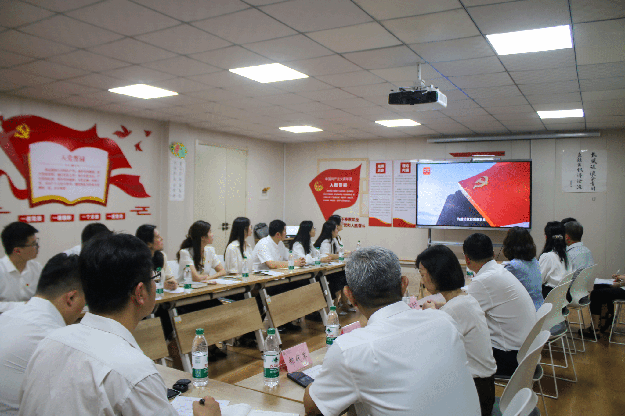 全体党员庄严地面向党旗,重温入党誓词,激励大家在新时代学校发展的新征程上永葆初心、勇担使命,在各自岗位上始终保持昂扬向上的奋斗激情。