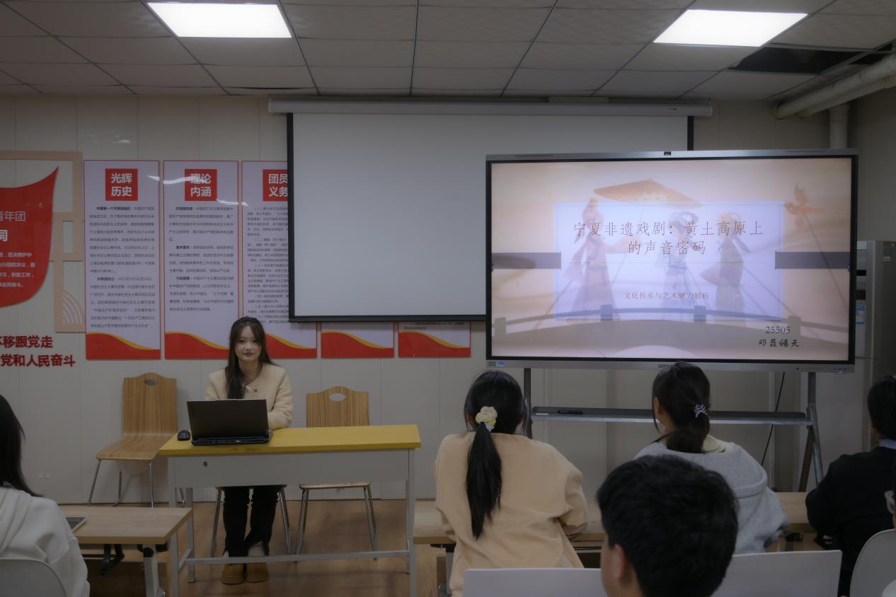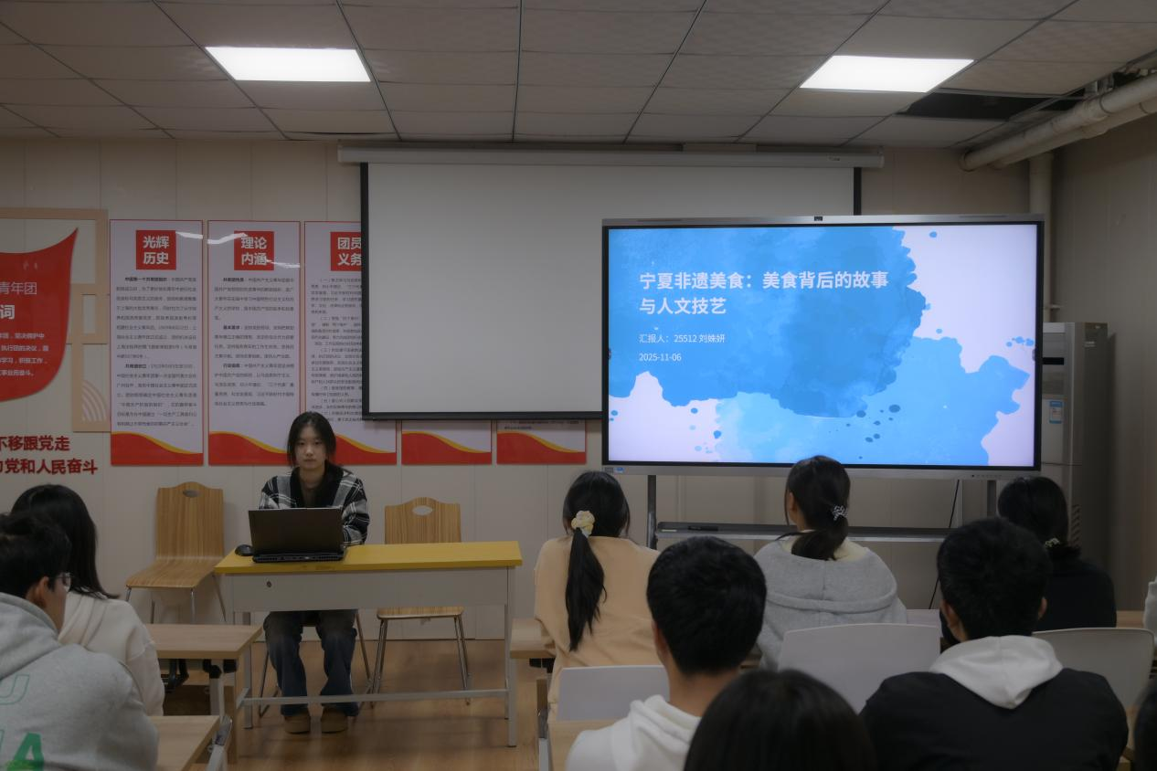24513书社的解景媛向同学们介绍了传统手工技艺,手工毯织造、非遗剪纸、丝织工艺等,体现了传统技艺的精湛与创新。25505书社的邓聂皓天介绍了传统戏剧、曲艺,秦腔、盐池道情、海原皮影戏,呈现了黄土高原上的声音密码。25512书社的刘姝妍介绍了非遗美食,手抓羊肉、八宝茶、荞面搅团等,体现了黄河农耕与草原牧业融合的饮食智慧。