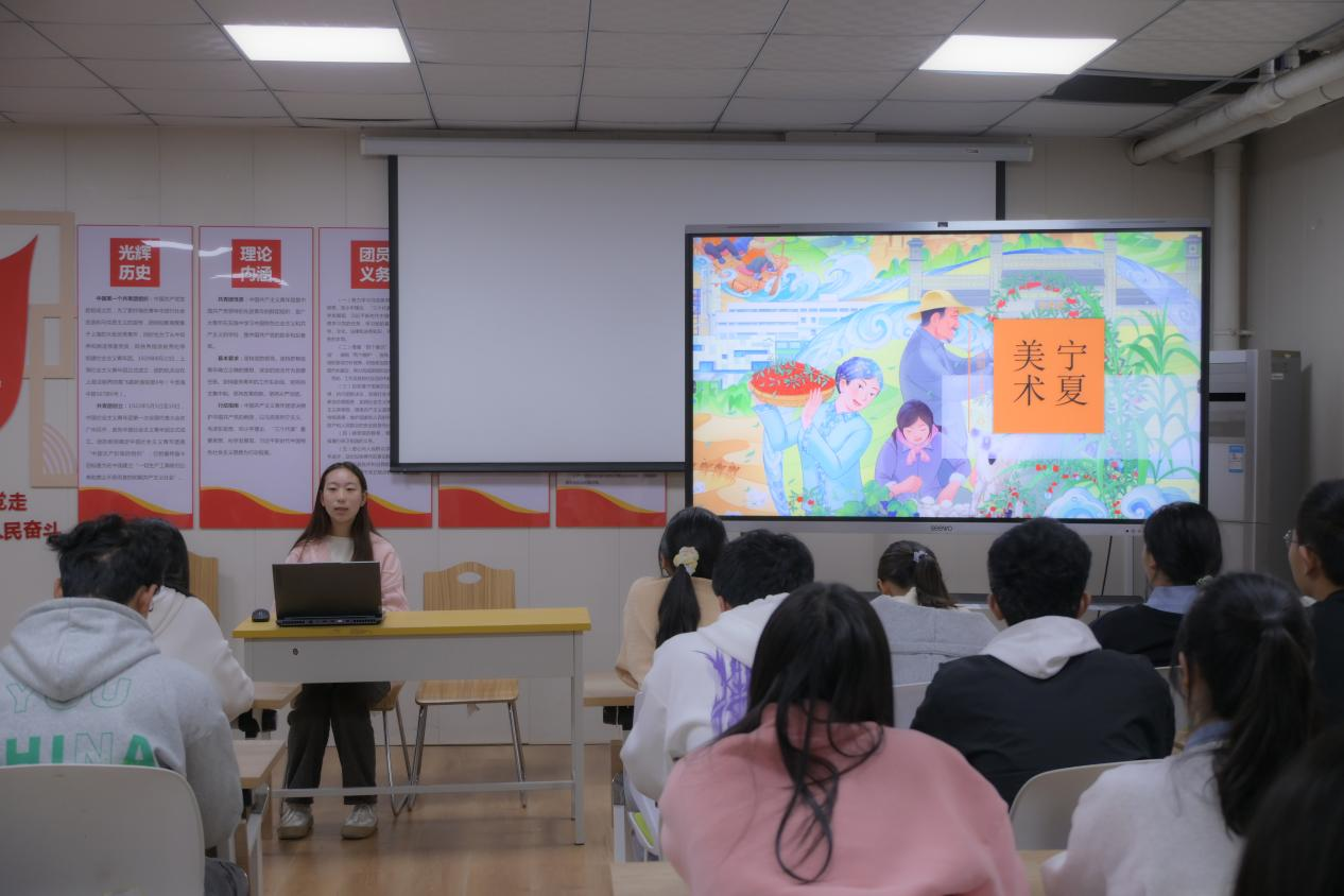 25509书社的曾佳仪介绍了民间舞蹈,回族山花儿歌舞、宴席舞,动作舒展且富有韵律,舞步融合了民俗活动中的礼仪姿态。25504书社的王瑞妍介绍民间美术,剪纸、石刻、年画等,展现了宁夏深厚的文化底蕴。