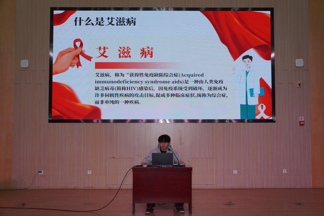 讲座中,邵子轩详细地解读了艾滋病的致病原理、传播途径及当前流行趋势,重点澄清了“日常接触会感染”“艾滋病无法预防”等常见认知误区,明确了性传播、血液传播、母婴传播三大核心传播途径,让同学们认清了风险源头,并强调“洁身自好、规范防护”是预防艾滋病的关键,鼓励大家要重视风险防范,更要摒弃歧视偏见。