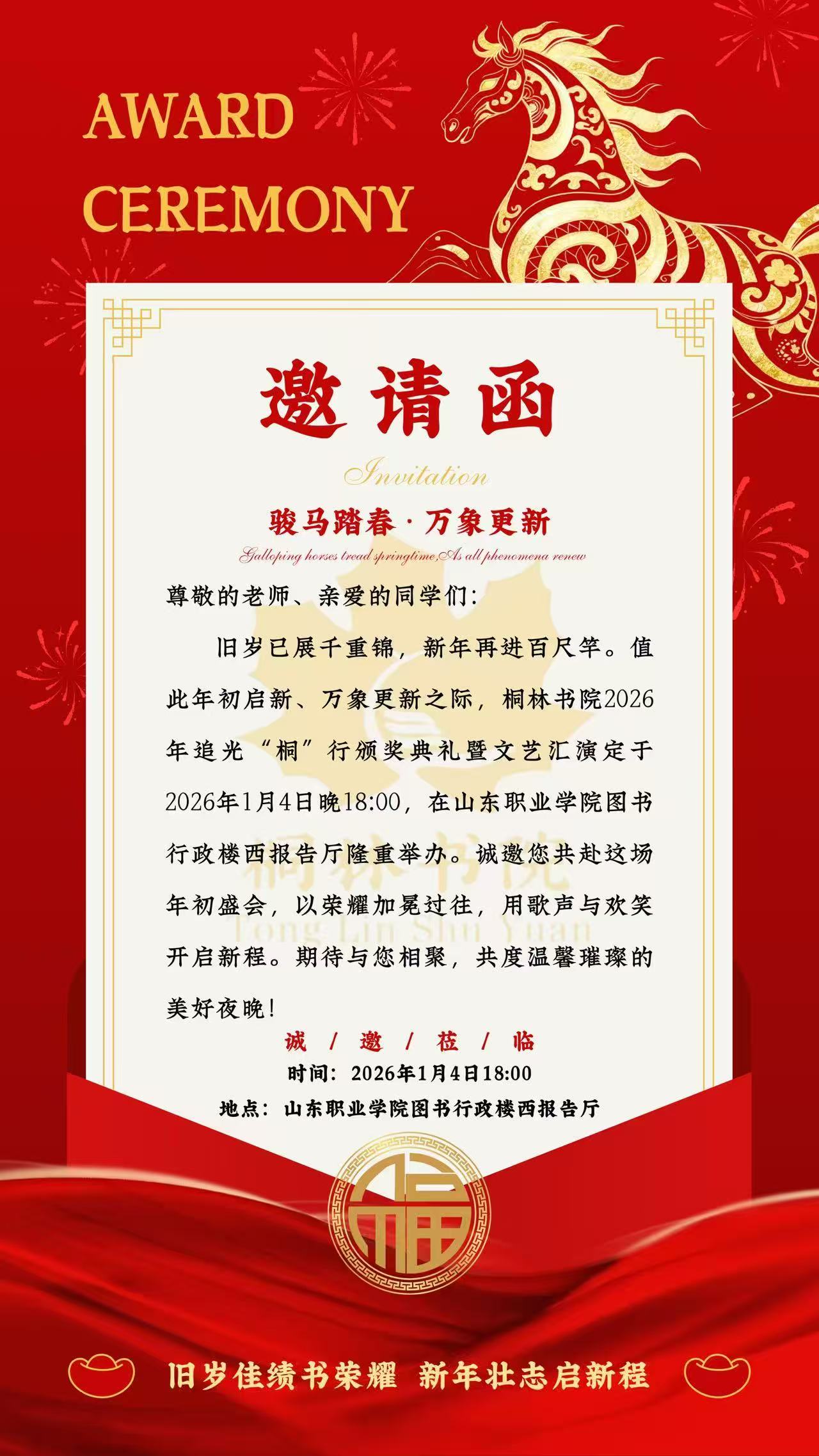 各位同学,桐林书院2026年追光“桐”行颁奖典礼暨文艺汇演,定于今晚18:00在图书行政楼西报告厅举办,诚邀各位同学参加,一同见证2025榜样力量,携手开启2026新篇章!