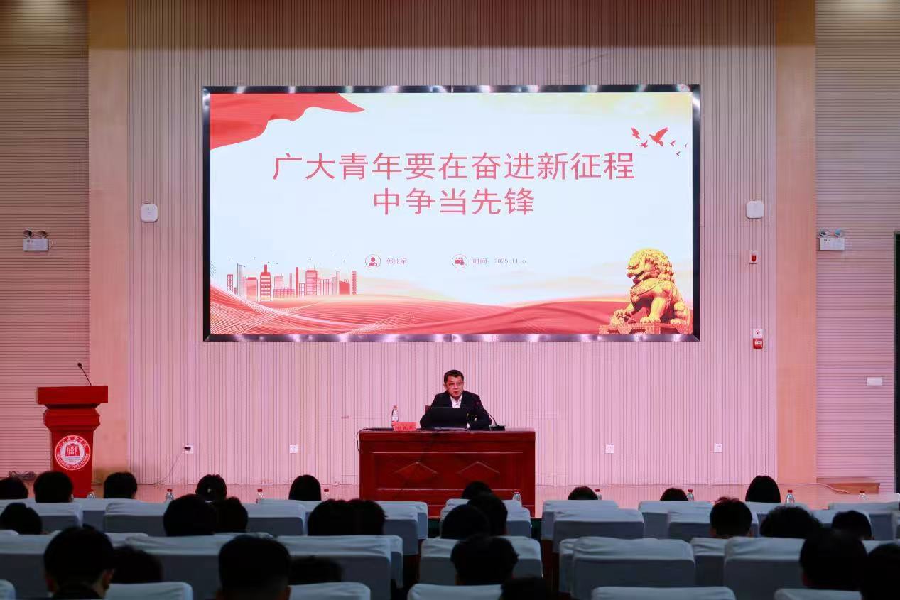为深入推进理想信念教育,引导学生深刻领悟新时代赋予的使命担当,11月6日,桐林书院在图书行政楼东报告厅开展“广大青年要在奋进新征程中争当先锋”主题党课活动。桐林书院党总支书记、院长郭兆军出席并授课,桐林书院副院长齐真、全体辅导员老师及全体学生干部参加活动。