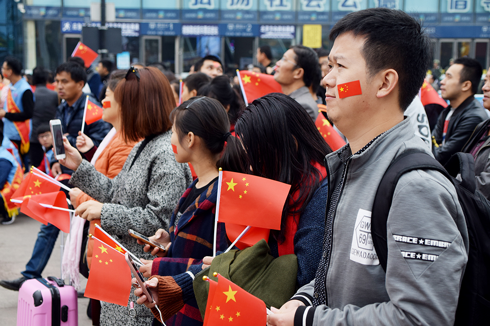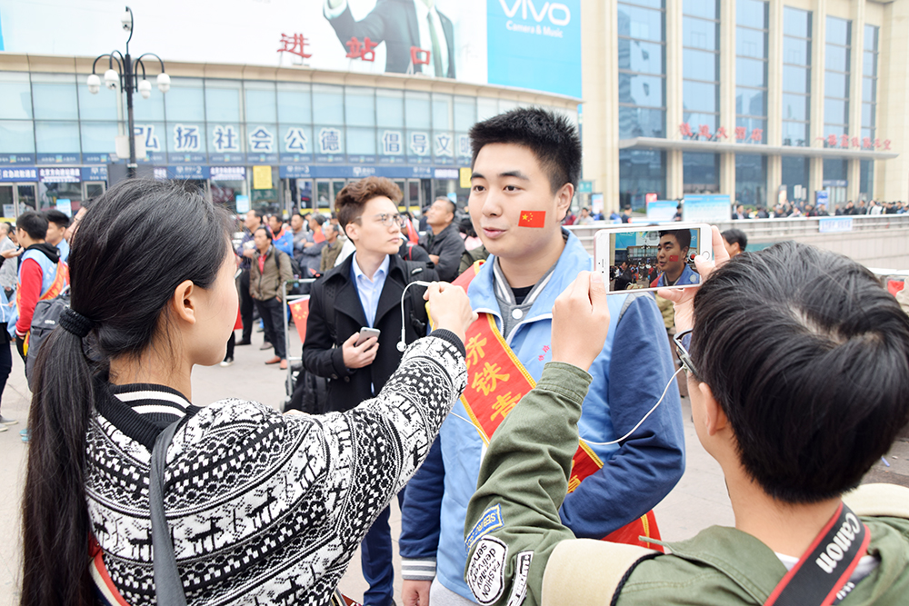 青年志愿者们积极维护广场秩序,让旅客们有序观看十九大开幕盛况,并为旅客发放手持国旗和国旗贴,营造喜庆氛围。志愿者与游客们挥舞着国旗,唱着国歌,谈祖国发展,谈身边变化,谈幸福生活,谈未来憧憬,脸上洋溢着自豪与骄傲。志愿者与旅客还将“国旗贴”贴在自己的胸口上,齐声说道“一心向党,不忘初心跟党走”,并伸出大拇指为祖国加油点赞。