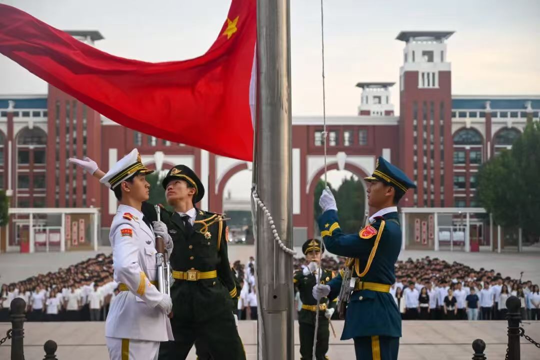 9月3日,为纪念中国人民抗日战争暨世界反法西斯战争胜利80周年,我校以“铭记与奋斗”为主题举行开学第一课。党委副书记郭鹏出席仪式并讲话。师生们齐聚喷泉广场,以升国旗、唱国歌、朗诵等多种形式上演了一堂热血澎湃的爱党爱国教育思政课。