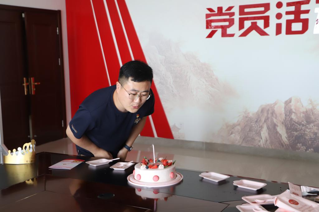 学团党支部全体党员同志共同点燃生日之火,切分生日蛋糕。