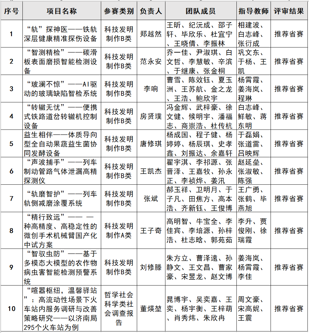 根据《关于组织开展第十九届“挑战杯”山东省大学生课外学术科技作品竞赛的通知》要求,经项目申报、资料审核、专家评审、路演答辩等环节,拟推荐“轨”探神医——铁轨深层健康精准探伤设备等10个项目进入省赛,现予以公示。公示时间:2025年4月17日-21日。