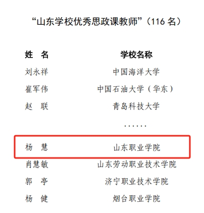 近日,中共山东省委教育工委公布了2024年度山东“十佳百优”学校思政课教师和高校辅导员评选结果。我校马克思主义学院教师杨慧获评“山东学校优秀思政课教师”,南山书院辅导员张英莉获评“山东高校优秀辅导员”。