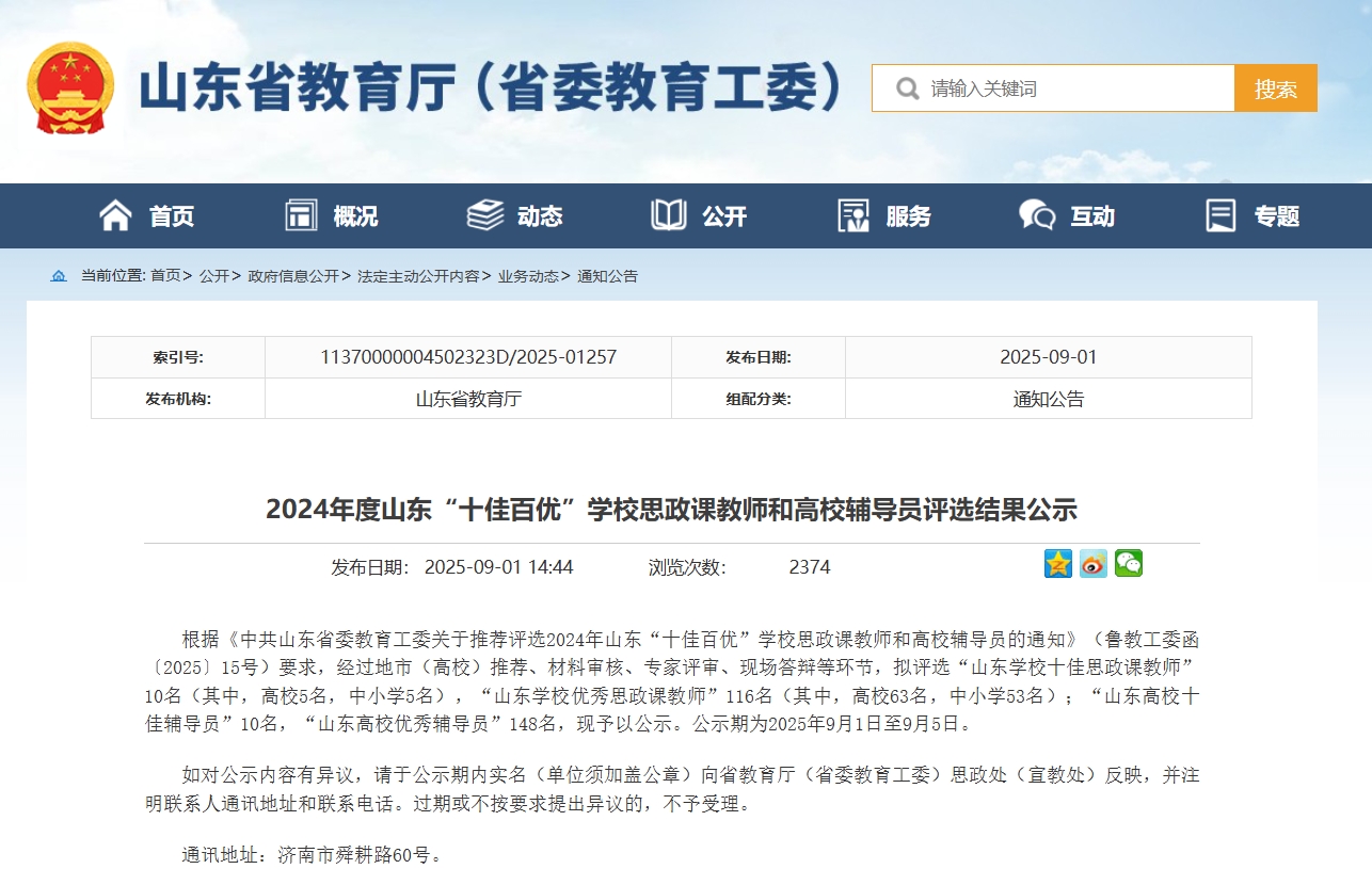 此次评选经地市(高校)推荐、材料审核、专家评审、现场答辩等环节。最终,评选出“山东学校十佳思政课教师”10名、“山东学校优秀思政课教师”116名以及“山东高校十佳辅导员”10名、“山东高校优秀辅导员”148名。