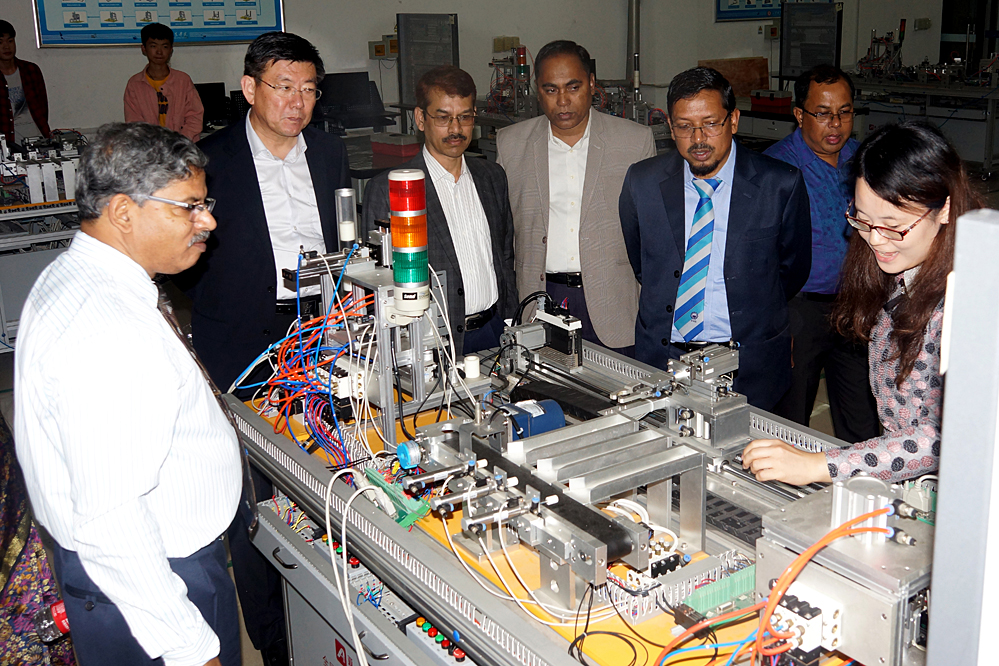 座谈结束后,王荣昌陪同CHANDA副秘书长一行参观了数控车间、机械制造工艺实训车间、激光雕刻及打标工作室、PLC工程实践实训室、数控车床装调实训室、机器人创新实训室、现代通信技术实训室、SMT实训室、施工技术实训场、轨道交通实训实验中心等实训场所。