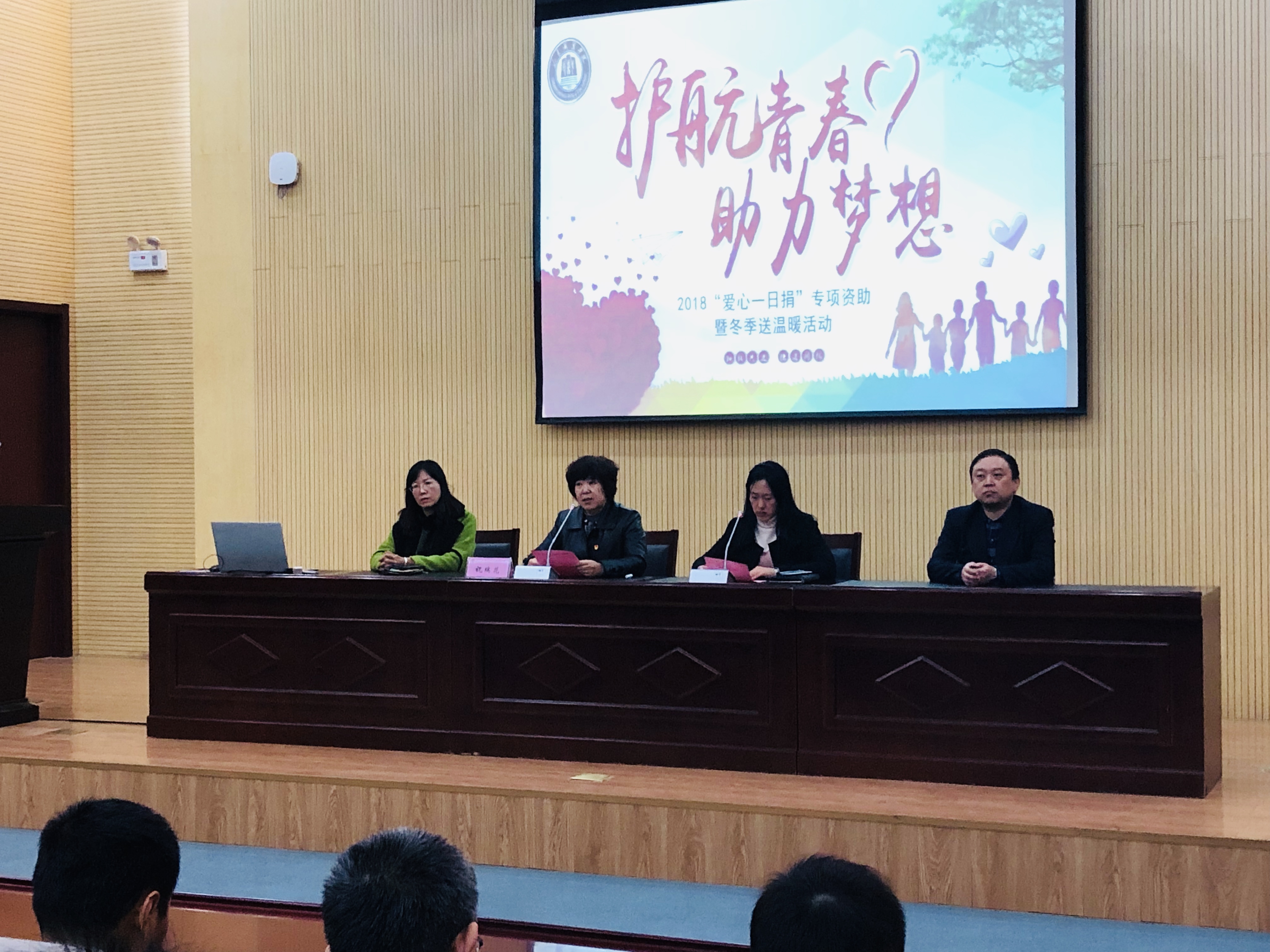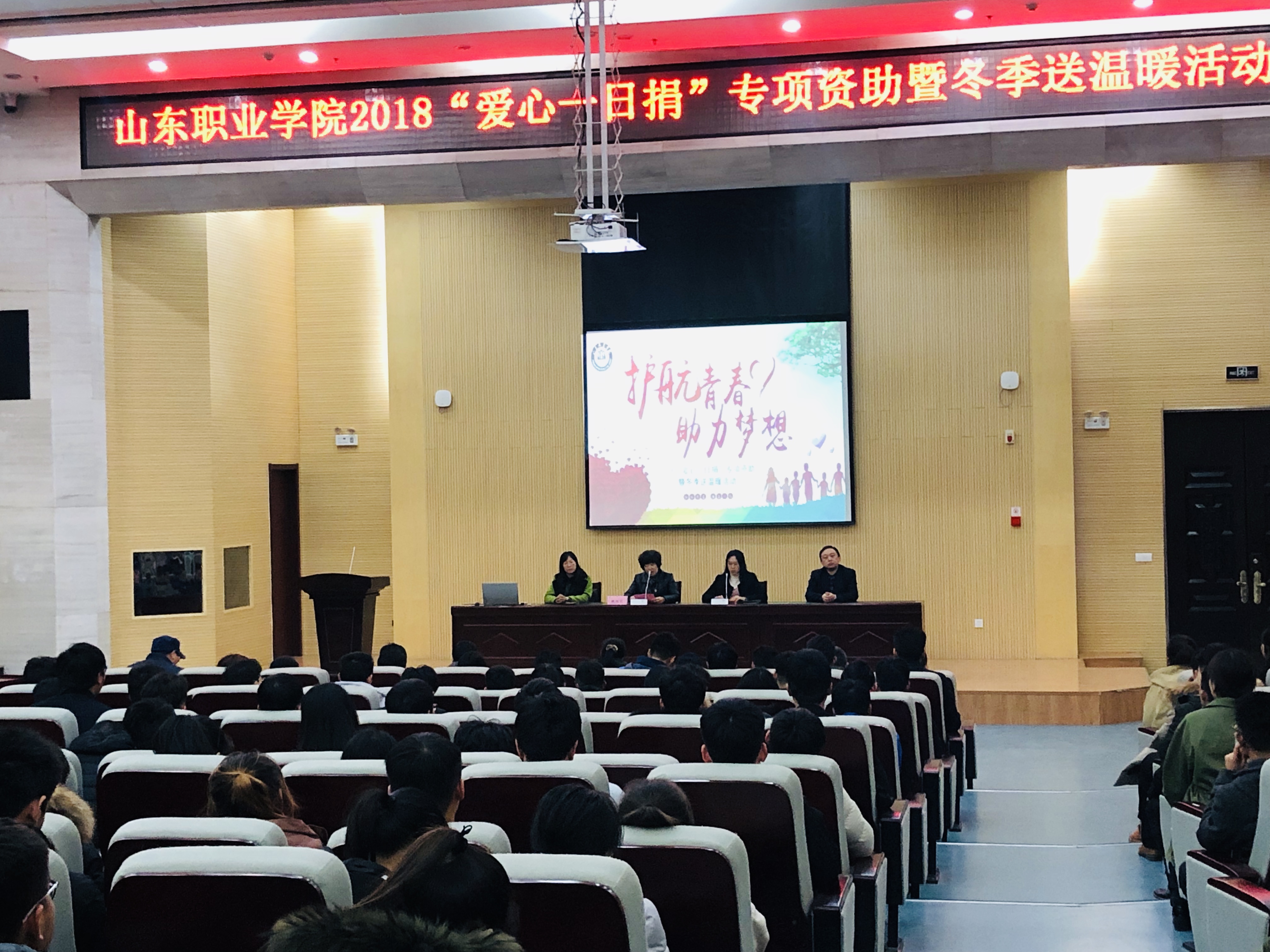 12月26日中午,我院举行了“护航青春,助力梦想”——2018“爱心一日捐”专项资助暨冬季送温暖活动。副院长祝瑞花出席活动并讲话,学生工作处处长刘红、副处长王宁、工会副主席赵欣及各系书记、学工办主任、资助负责老师和全体受资助学生200余人参加活动。