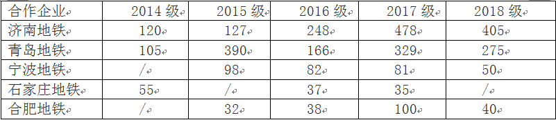 学院积极推进“面向山东、辐射全国”的订单培养战略布局,近年来,先后与深圳、宁波、青岛、杭州、济南等15个地铁公司组建120多个订单班,累计输送人才近3800名。2018届毕业生中,订单培养人数达839人,占毕业生总数的18%。学院不断深化“订单培养”人才培养模式改革,与企业合作开展“现代学徒制”“校企一体化合作办学”等试点。“订单培养”模式的建立,打造了“入学即就业”的培养方式,构建起学生进入企业的直接通道,进一步促进产业、岗位、教学的深度融合,实现了学习实践的无缝衔接,推动学生、员工职业角色的顺畅转换。