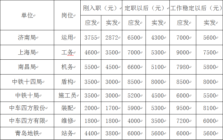 表2:部分轨道交通企业就业毕业生薪酬统计一览表