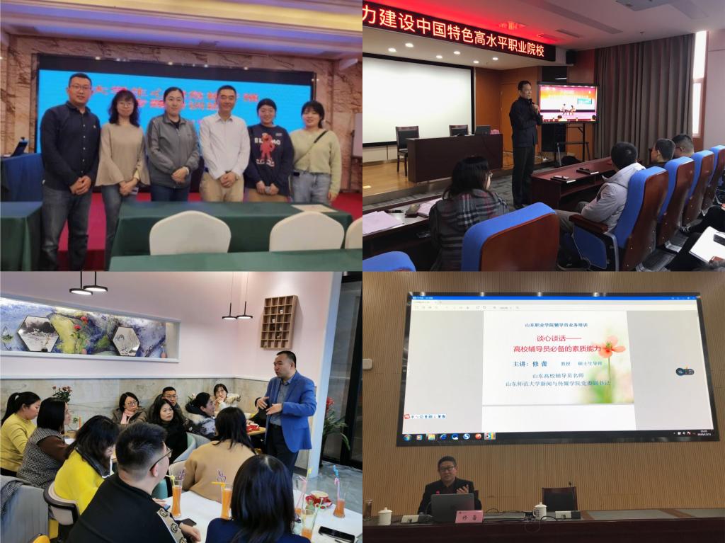 先后派出7名辅导员老师参加大学生心理危机干预实务专题培训班。邀请山东省高校辅导员工作研究及培训基地办公室常务副主任申钊教授、苏州大学人际沟通研究中心主任滕晖教授和山东师范大学新闻与传媒学院党委副书记修蕾教授分别作《辅导员职业能力发展的路径》《大学生心理危机干预与沟通谈话技巧》《谈心谈话——高校辅导员必备的素质能力》专题讲座,着力提升辅导员职业生涯规划、解决实际问题以及处理应急事件的能力。