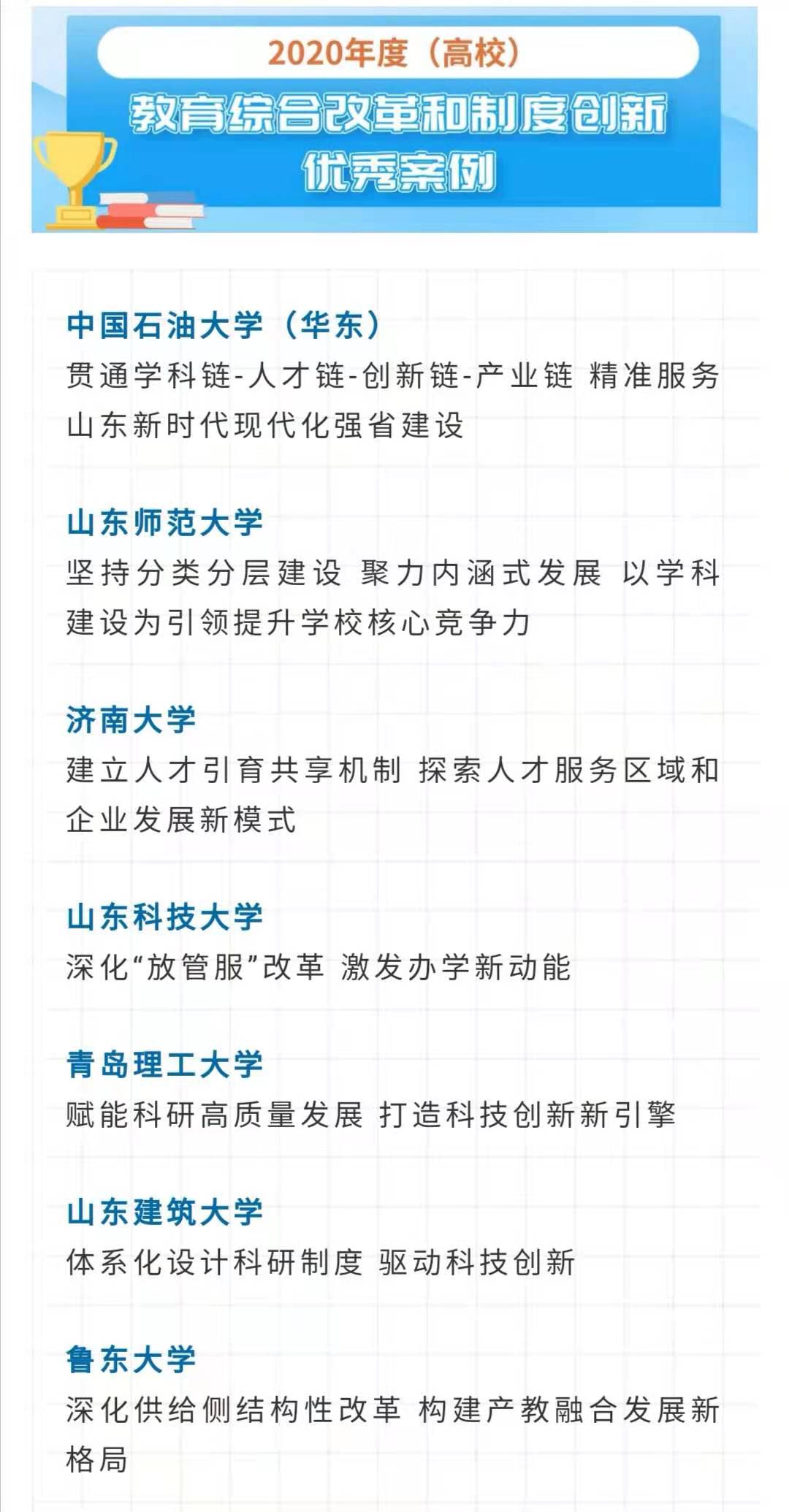 山东省教育厅组织开展的2020年度教育综合改革和制度创新典型案例评选活动,旨在全面展示我省2020年度教育综合改革和制度创新的成果,推动教育改革和创新工作的深入开展。经各市教育(教体)局、各高等学校报送,共有144个案例参加评选。经评审,评出了“2020年度(市教育行政部门)教育综合改革和制度创新十佳案例”10项、“2020年度(市教育行政部门)教育综合改革和制度创新优秀案例”3项、“2020年度(高校)教育综合改革和制度创新十佳案例”10项和“2020年度(高校)教育综合改革和制度创新优秀案例”20项。